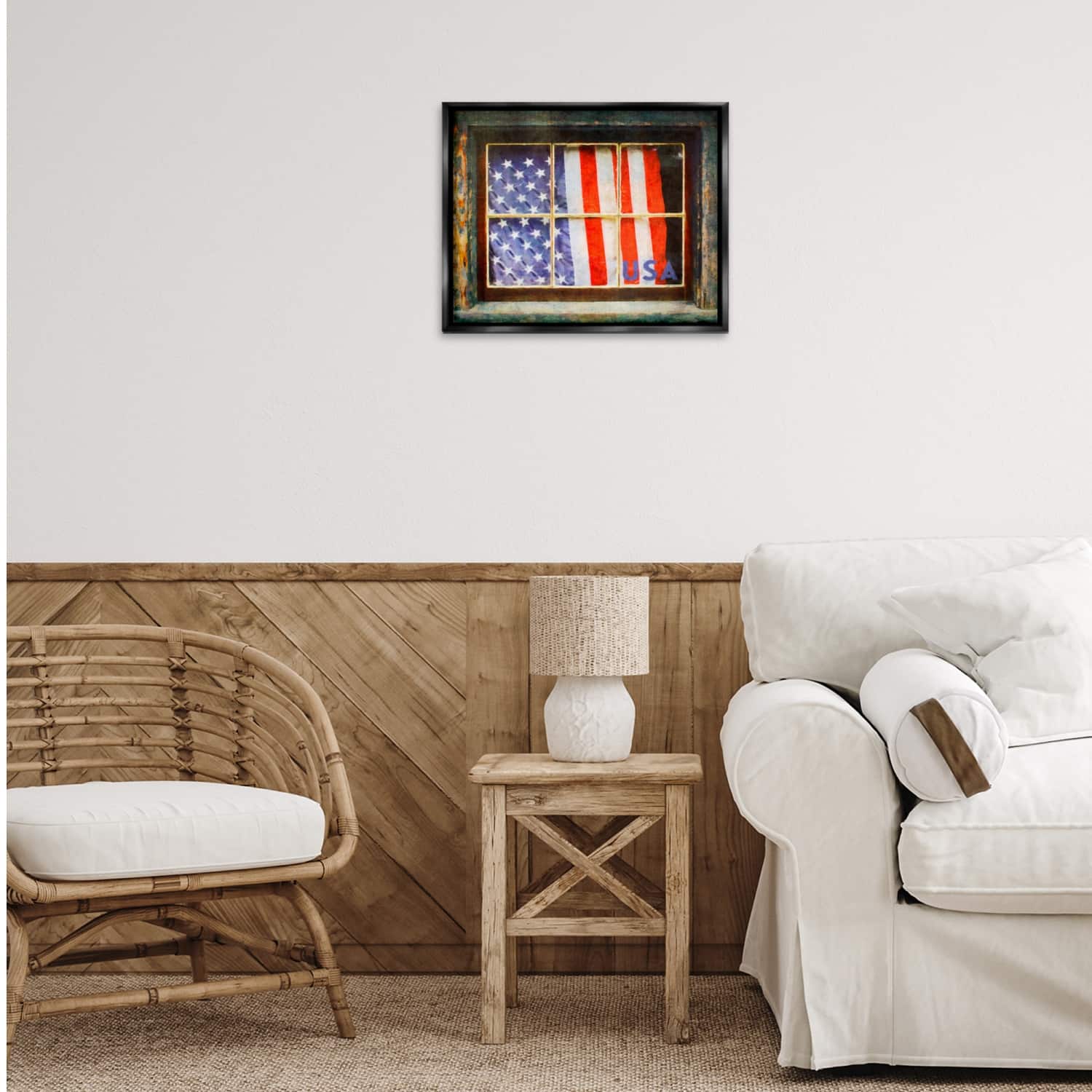 Stupell Industries Patriotic American Flag Rustic Window Festive Home Floater Framed Art