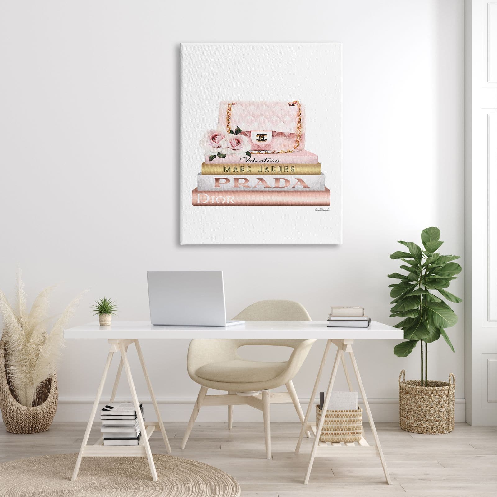 Stupell Industries Pink Purse Gold Bookstack Glam Fashion Watercolor Design Canvas Wall Art