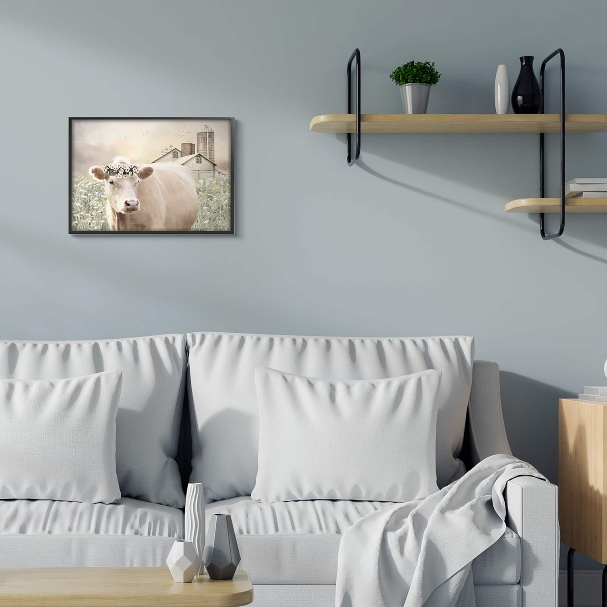 Stupell Industries Realistic Cow Floral Crown Tranquil Farm Field in Black Frame Wall Art