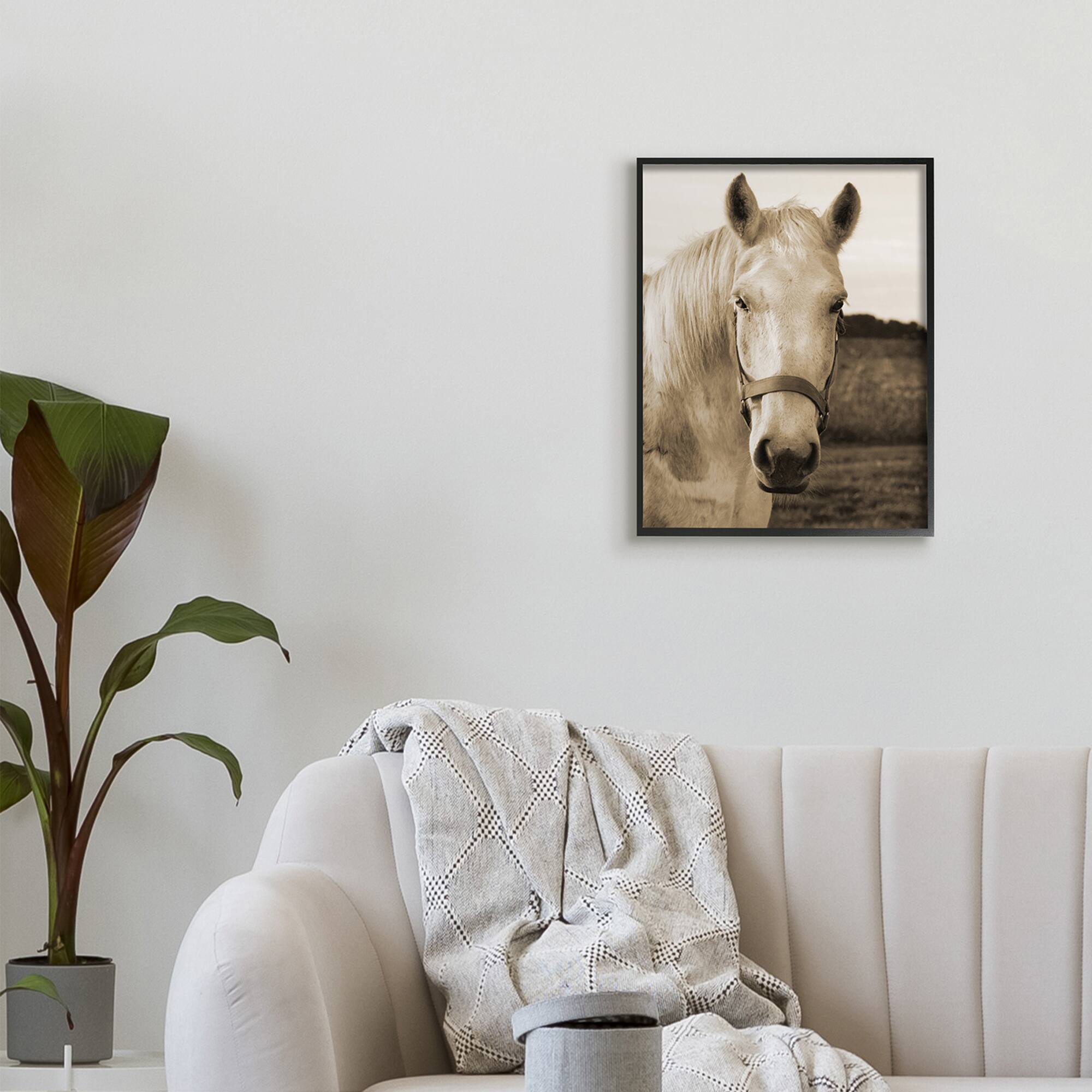 Stupell Industries Rustic Sepia tone Portrait of White Horse in Black Frame Wall Art