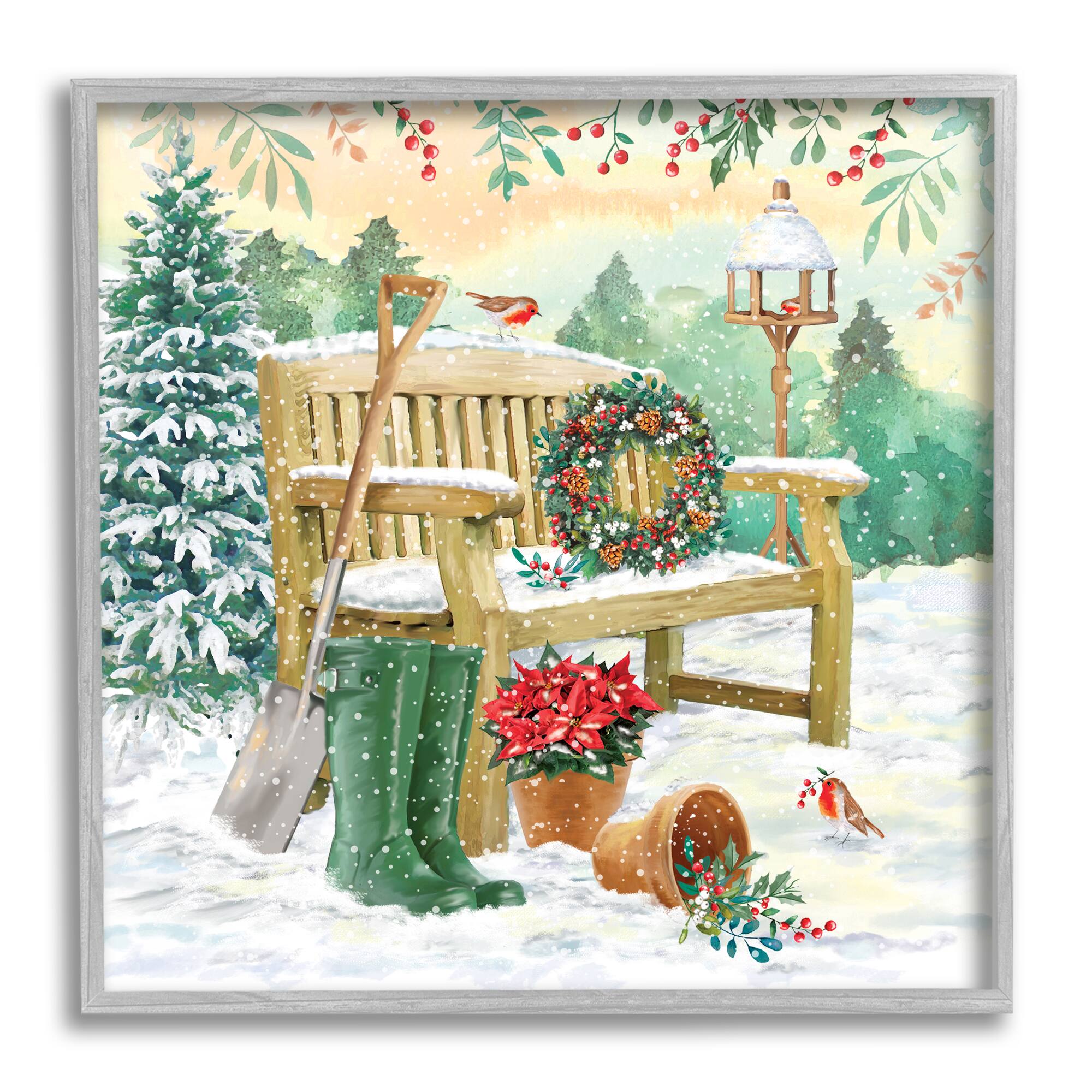 Stupell Industries Snowy Bench Seasonal Holly Plants Framed Giclee Art
