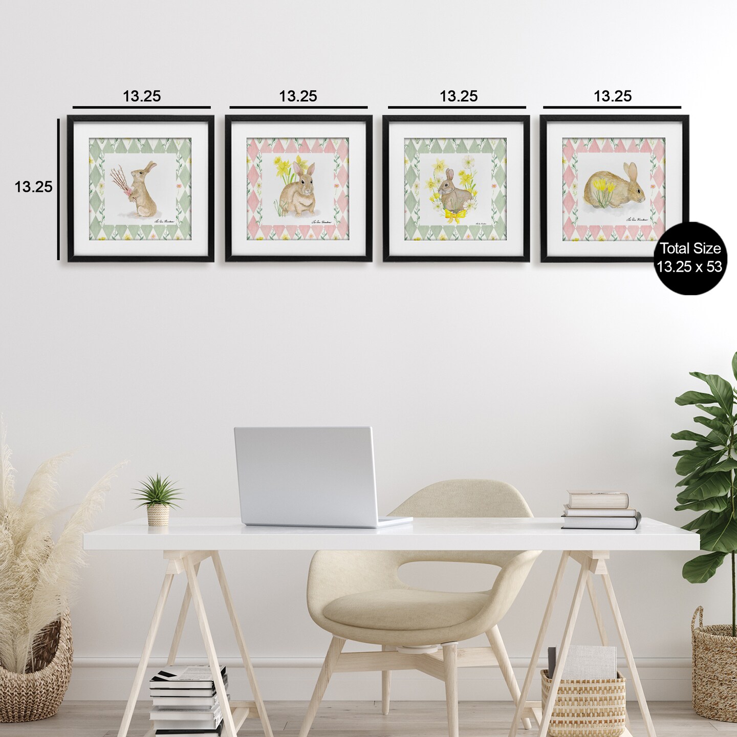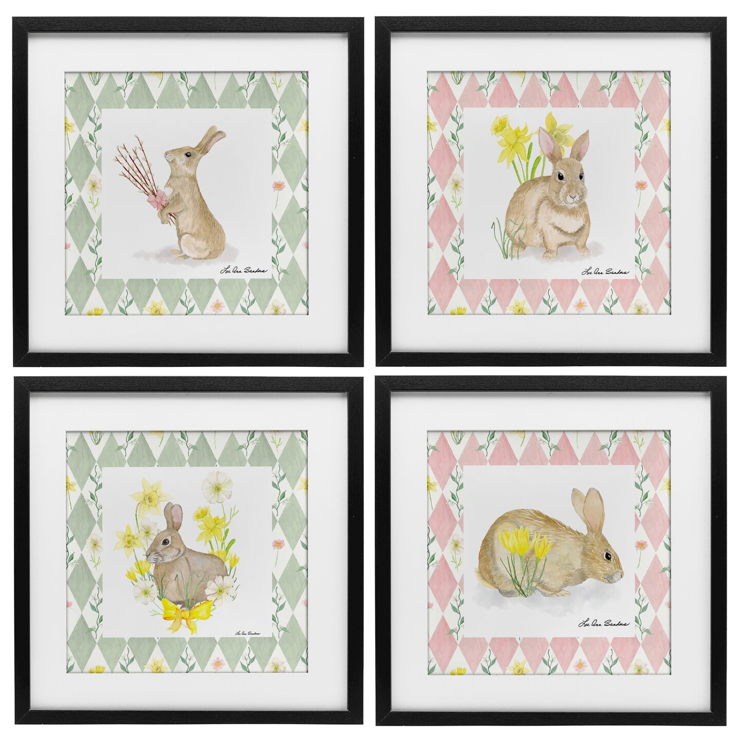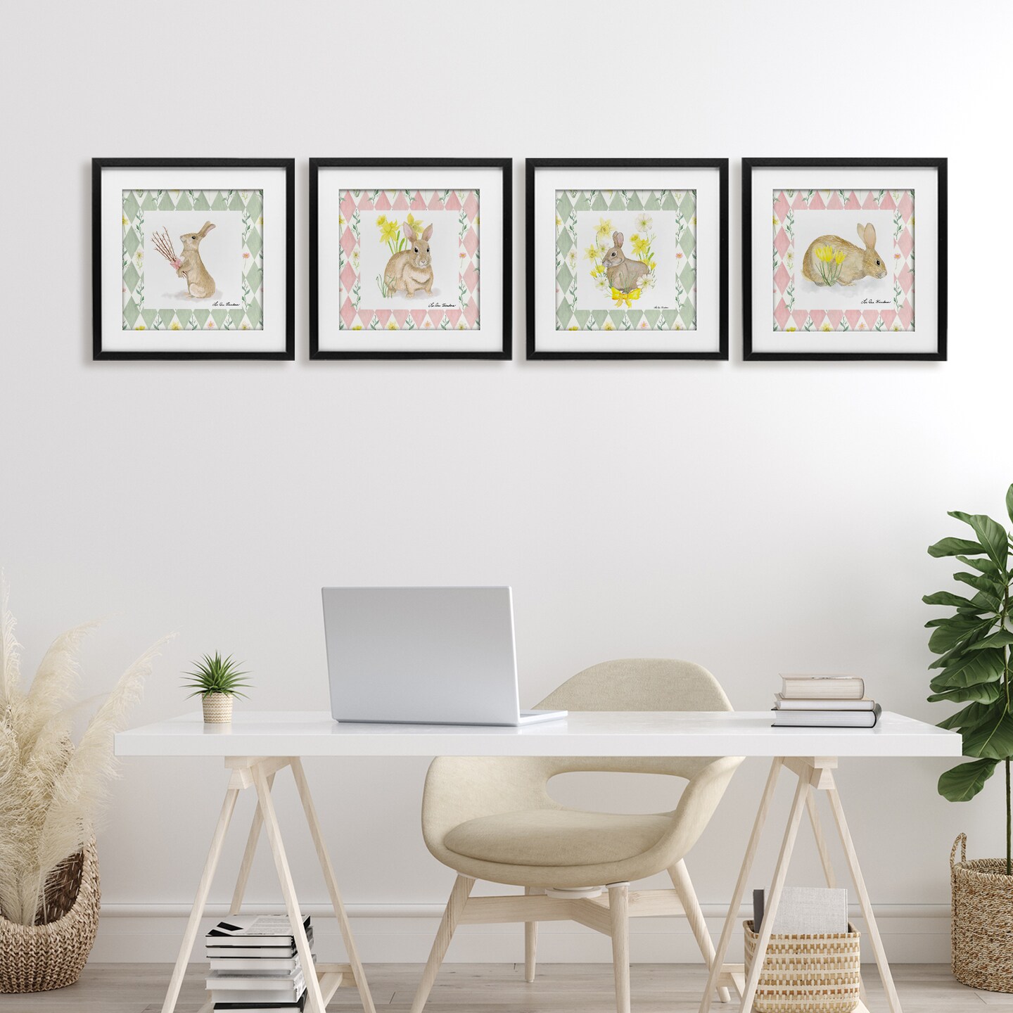 Stupell Industries Spring Bunnies on Argyle 4pc Framed Print Under Glass Set, design by Lee Ann Sanders