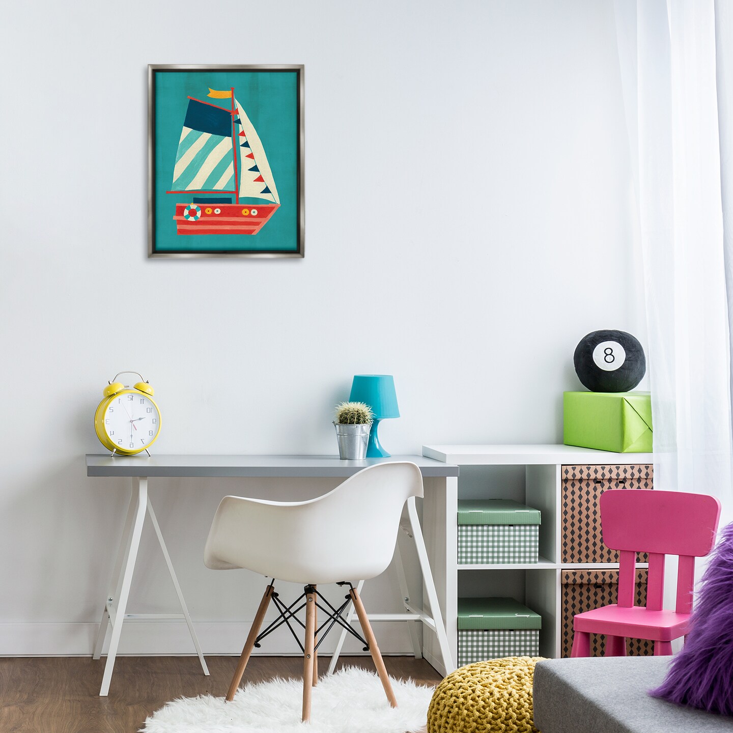 Stupell Industries Striped Sailboat on Blue Framed Floater Canvas Wall Art Design by Irene Chan