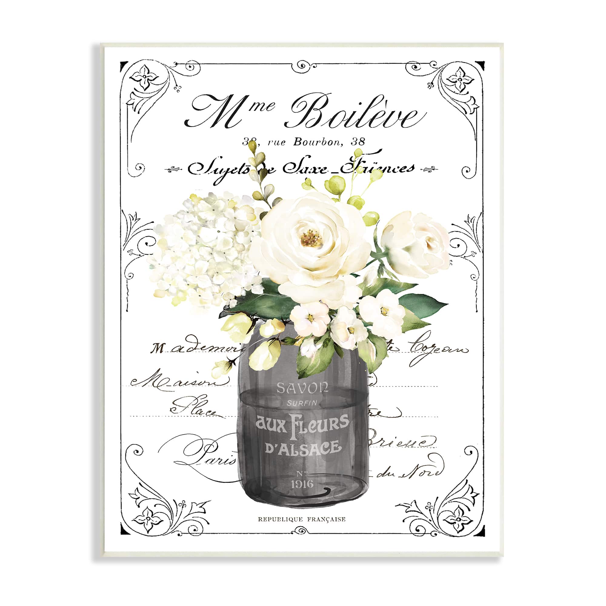 Stupell Industries Vintage Parisian Bathroom Floral Bouquet White Flowers Wood Wall Plaque