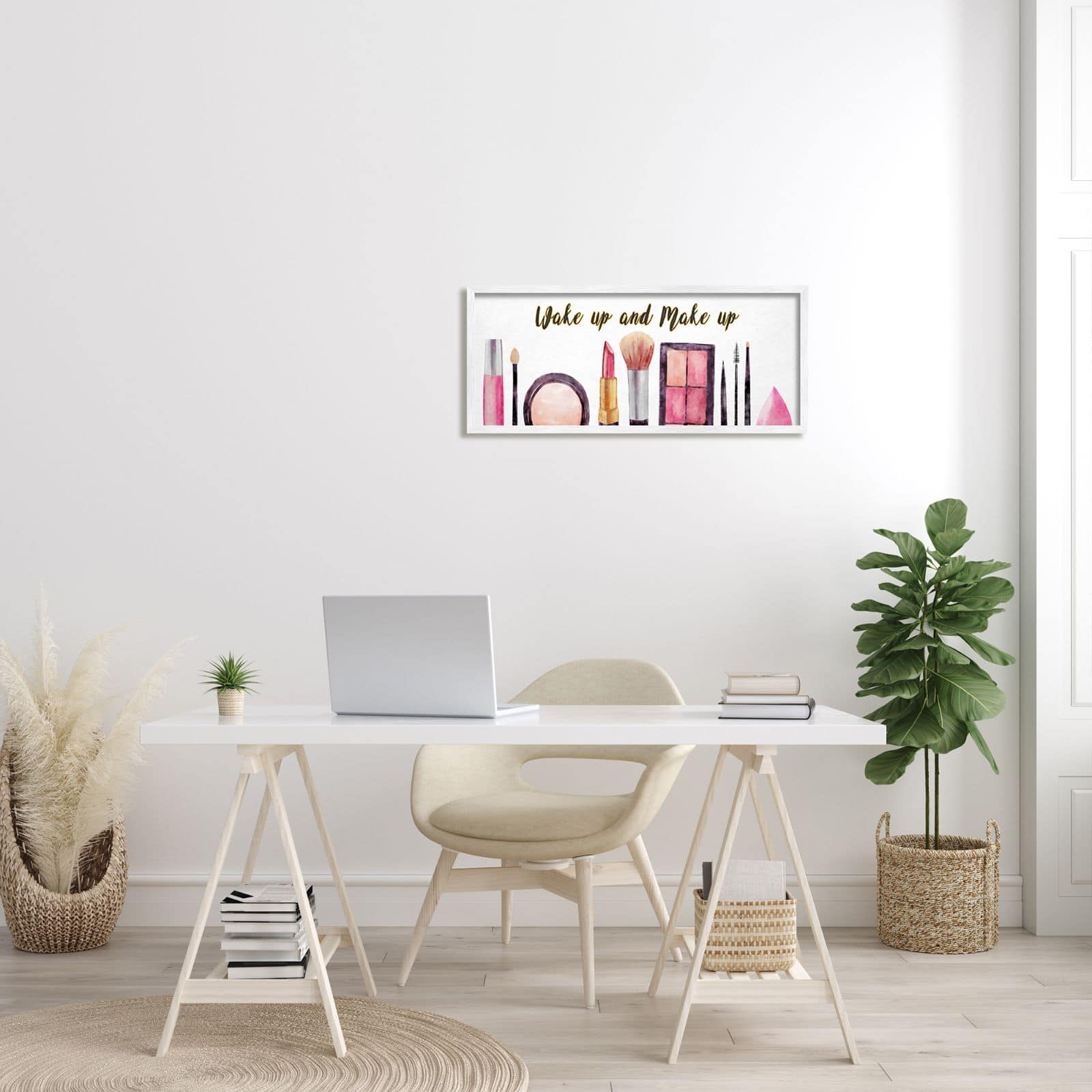 Stupell Industries Wake Up Make Up Watercolor Pink Grey Fashion Word Design Framed Wall Art