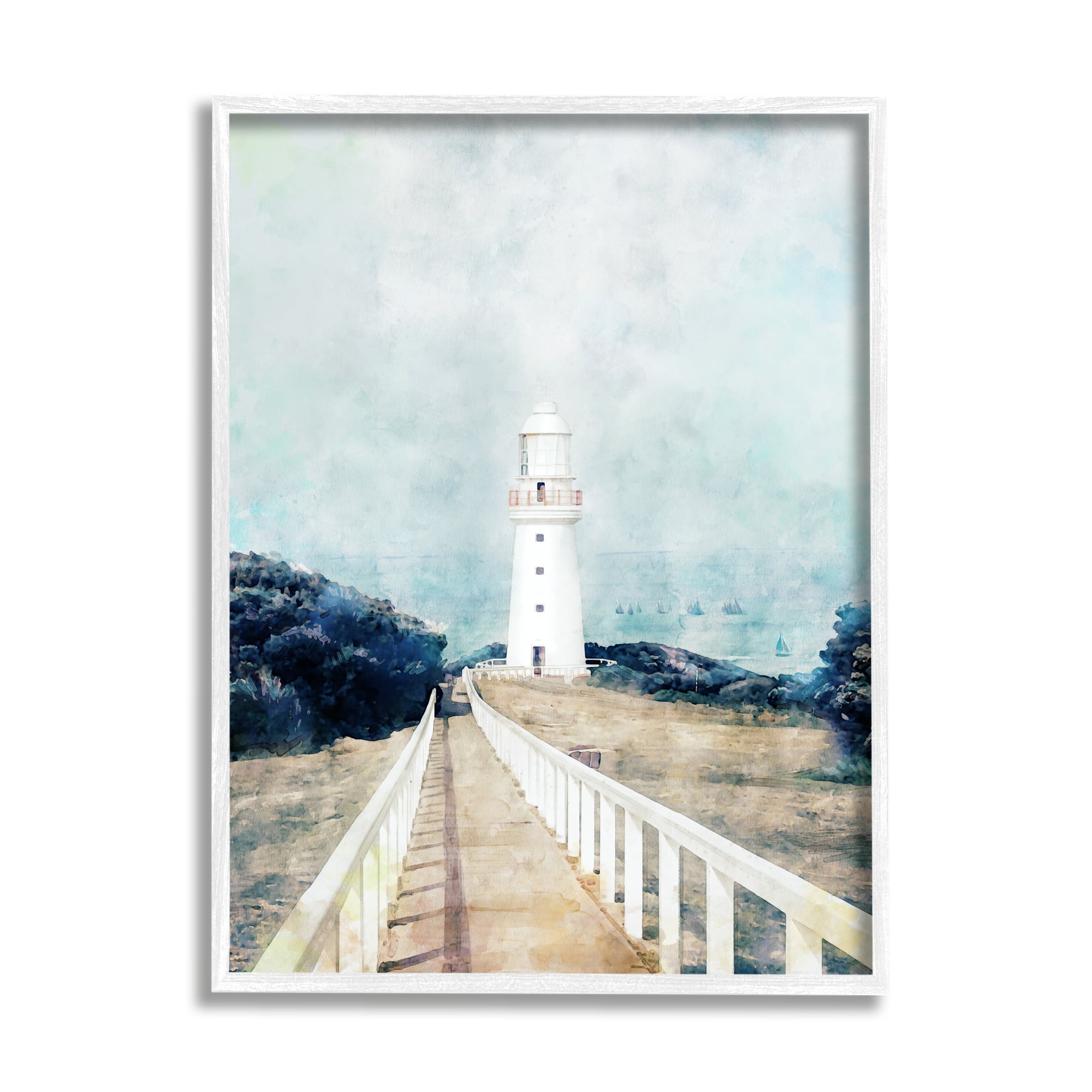Stupell Industries White Lighthouse Boardwalk Rocky Cliff Coastal Landscape Water Framed Wall Art