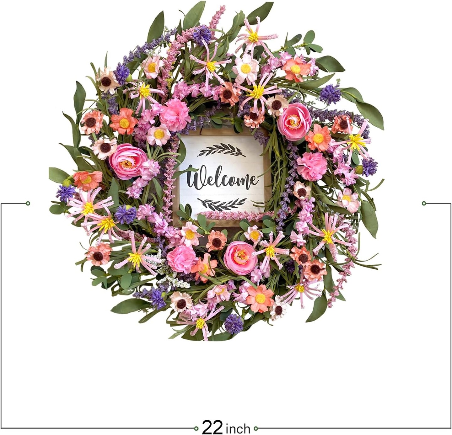 Summer 22 Inch Wreath for Front Door, Artificial Floral Wreath with Roses, Wild Flowers, Leaves, and Welcome Board, Farmhouse Indoor/Outdoor Wall Decor
