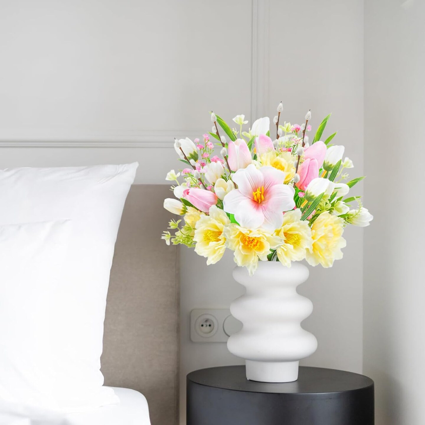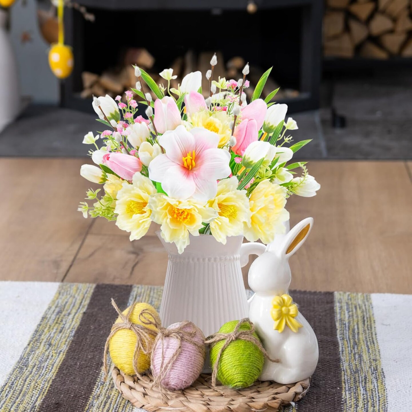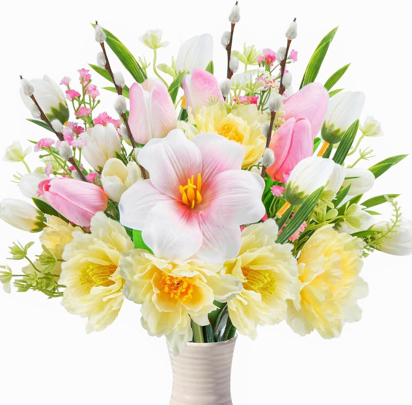 Summer Artificial Flower Arrangement – 16.14" Mixed Yellow Tulip and Peony Silk Bouquet with Branches for Home Vase Centerpiece or Table Decor