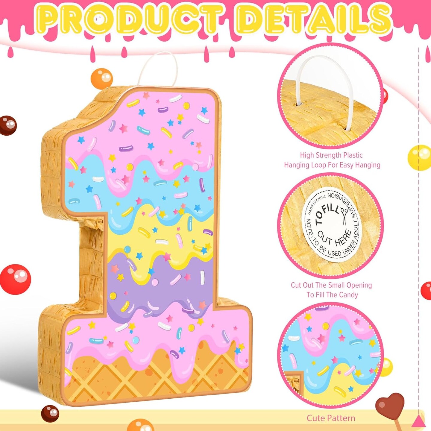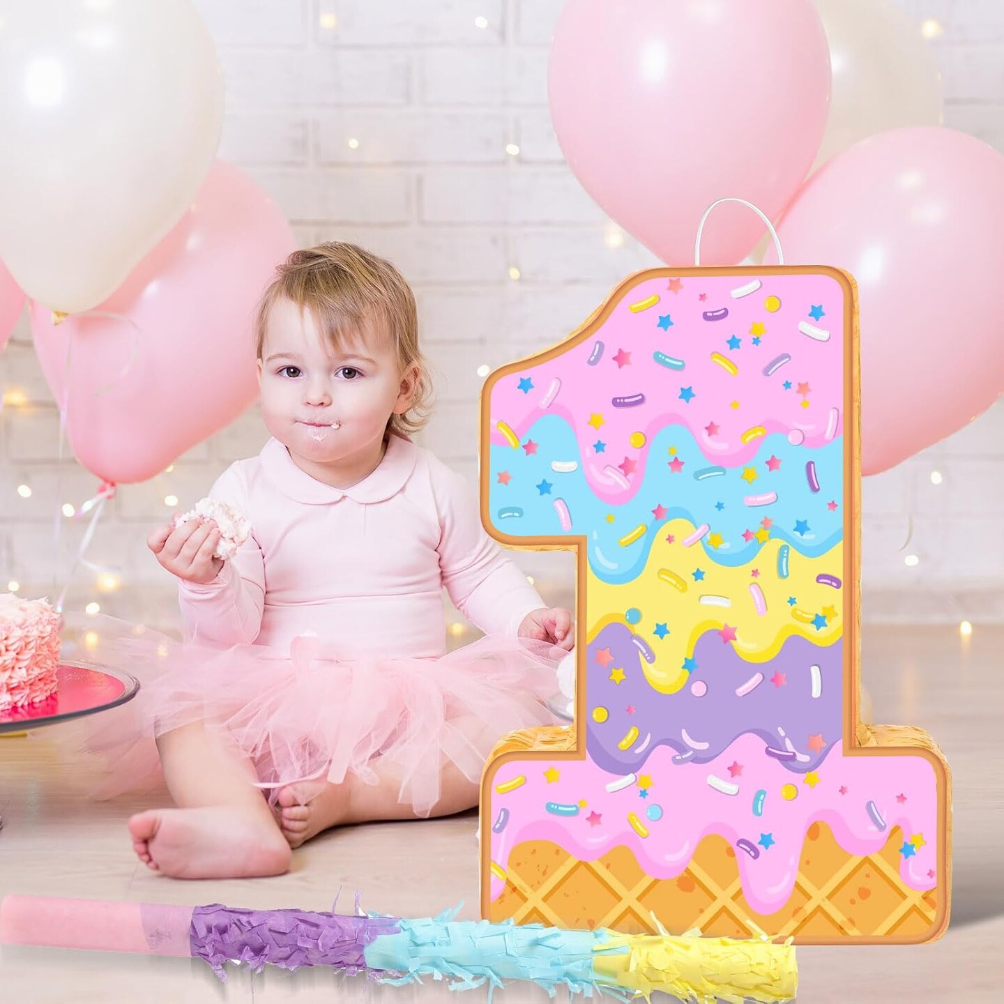 Summer Birthday Piñata Ice Cream Game Set Summer Number Piñata with Bat Stick Blindfold Mask Confetti for Sundae Theme Birthday