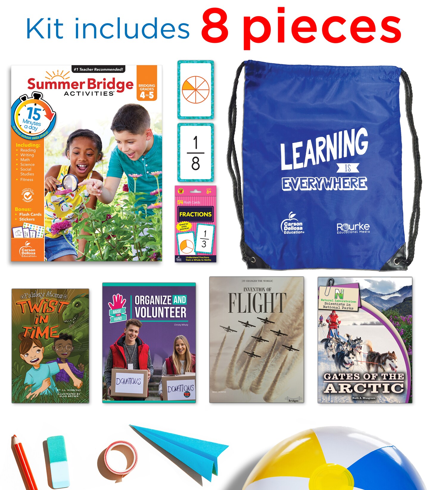 Summer Bridge Activities 4-5 Bundle, Ages 9-10, Math, Language Arts, and Science Summer Learning 5th Grade Workbooks All Subjects, Fractions Math Flash Cards, Children's Books, and Drawstring Bag