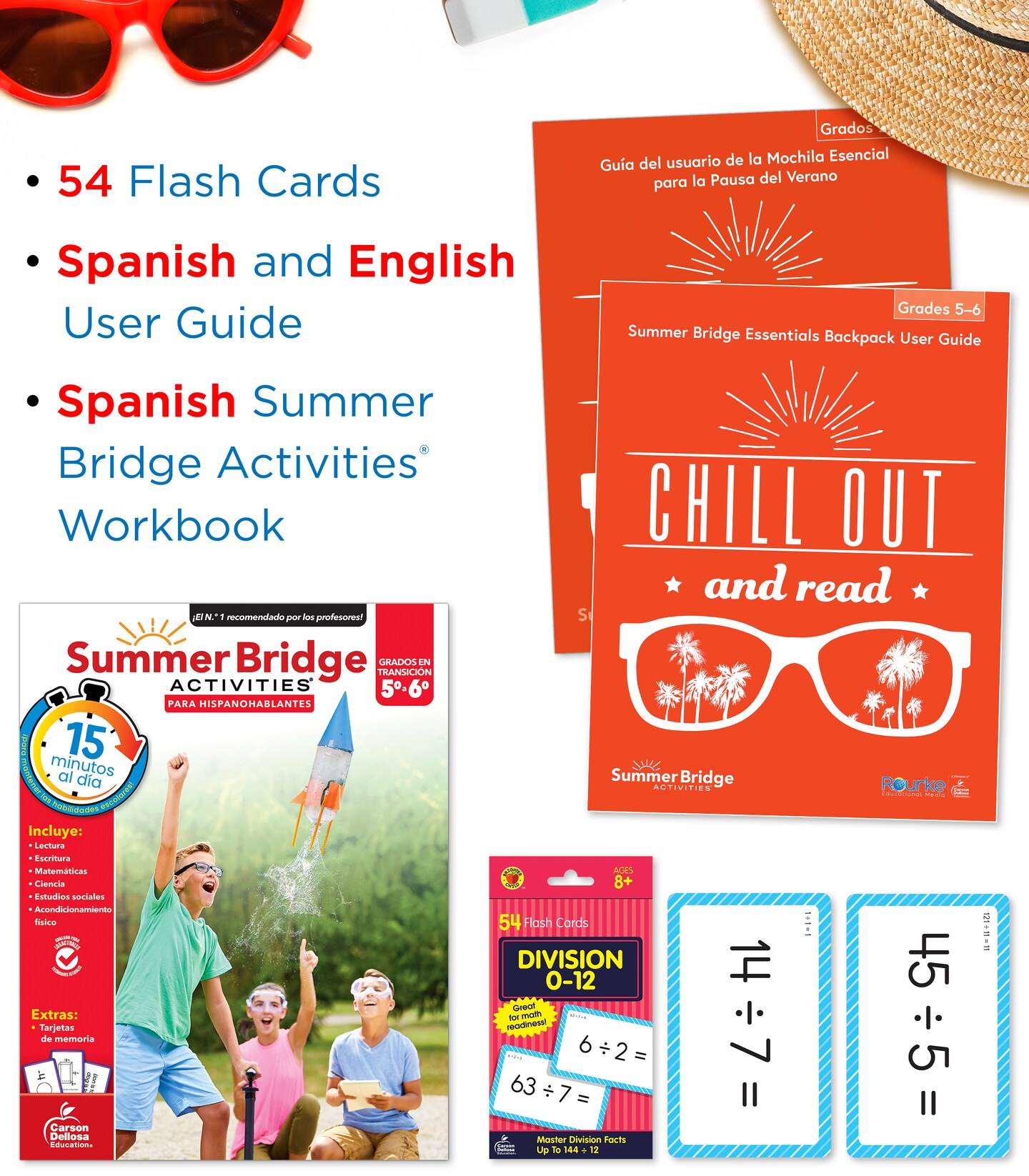 Summer Bridge Activities 5-6 Spanish Summer Learning Resources, Spanish Language 5th Grade to 6th Grade Workbook All Subjects, Division Math Flash Cards, 4 Children's Books, Drawstring Bag