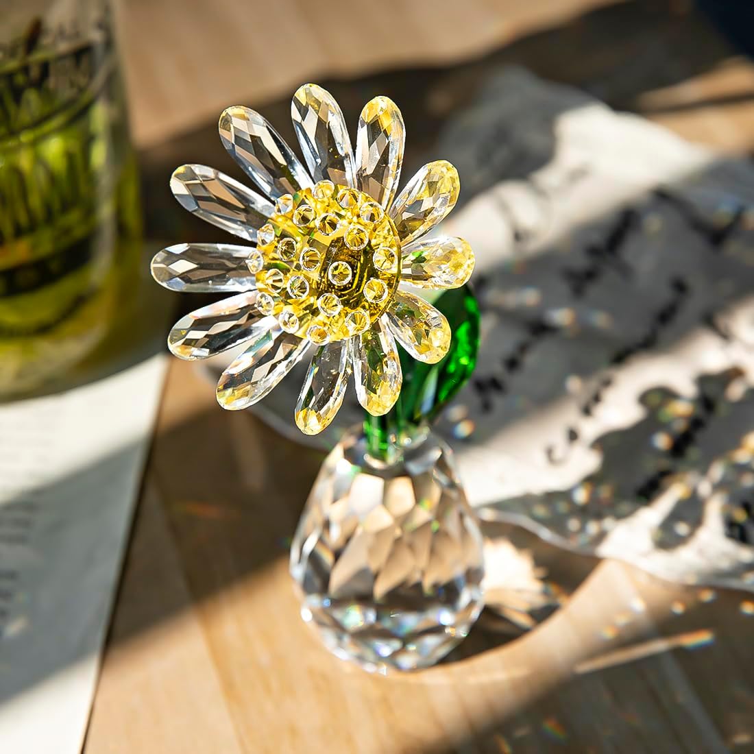 Summer Crystal Daisy Flower Figurine Ornament Paperweight Glass Flower Home Office Tabletop Decor Souvenir Gifts for Birthday Christmas