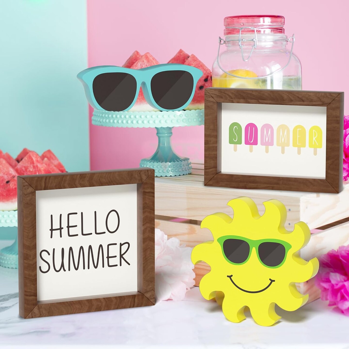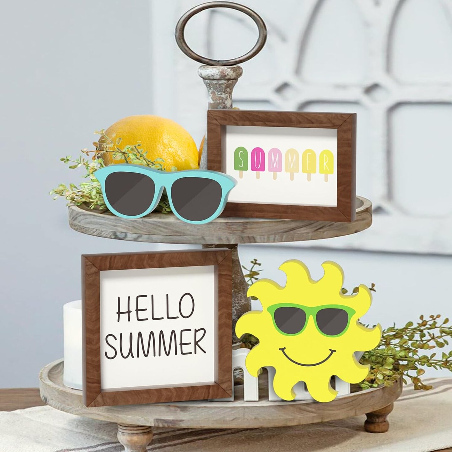 Summer Decorations Wooden Tiered Tray Decor, Hello Summer Sun Sunglasses Wooden Signs Table Decor