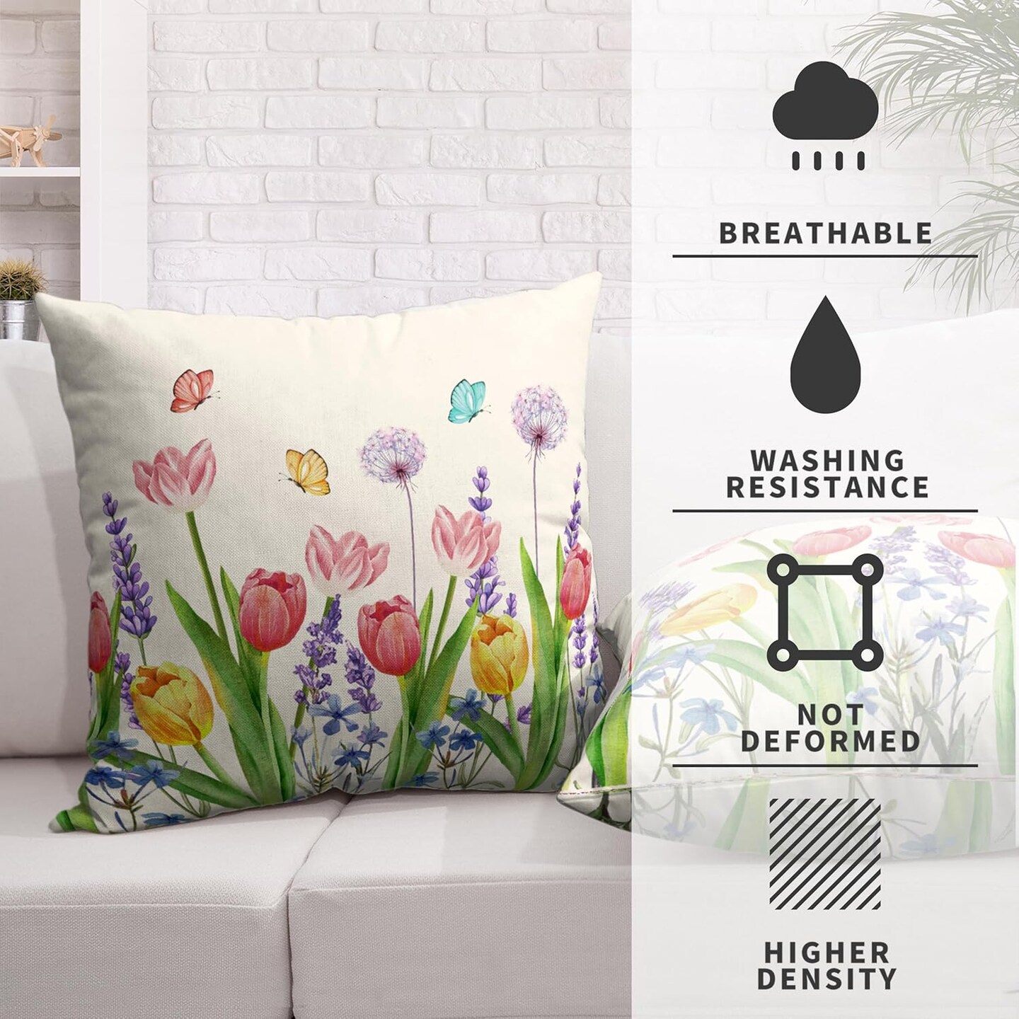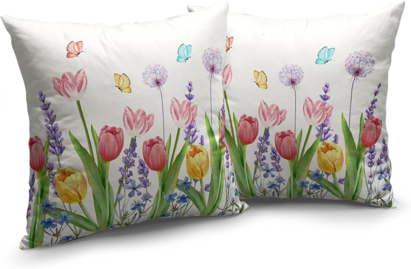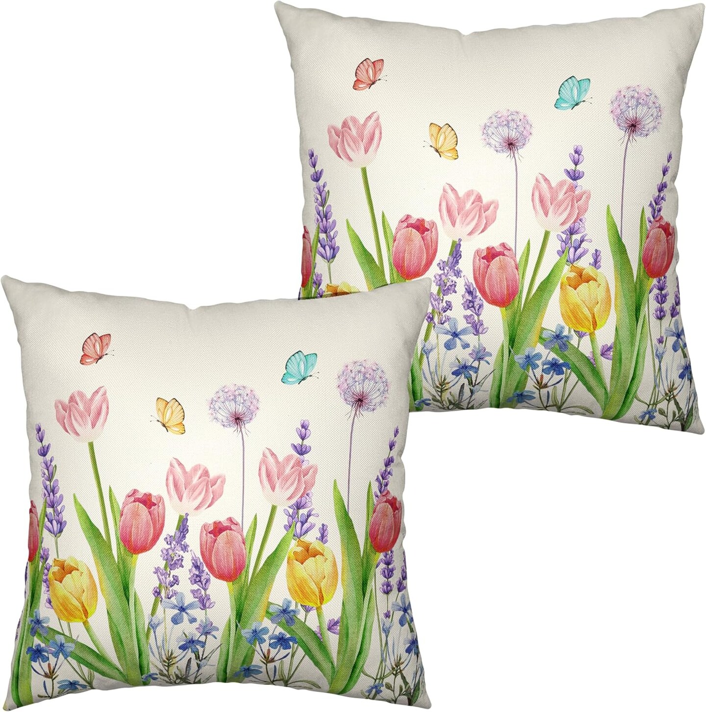 Summer Floral Throw Pillows Cover 18x18 Set of 2 Pink Tulip Flower Pillow Covers Lavender Dandelion Butterfly Decorative Pillow Case for Farmhouse Patio Sofa Couch