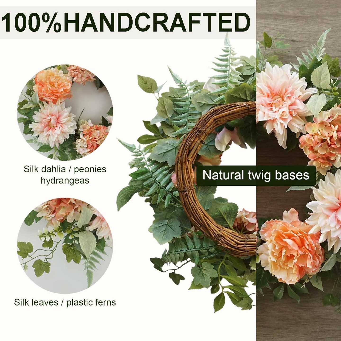 Summer Floral Wreath for Front Door, 20 Inch Artificial Wreath with Peony, Dahlia, and Hydrangea Flowers, Floral Wreath for Window, Porch, and Wall Decor, Year-Round Home Decoration