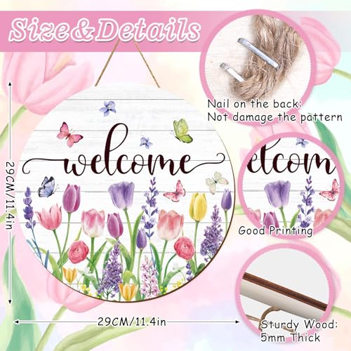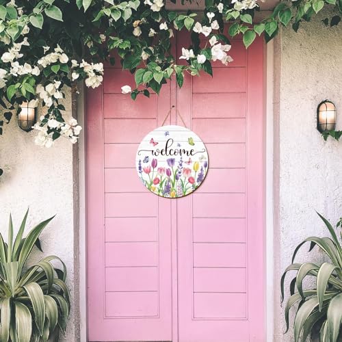 Summer Flower Welcome Door Sign Tulip Wooden Hanging Sign Floral Butterfly Door Hanger Sign for Spring Summer Holiday Indoor Outdoor Farmhouse Home Porch Window Decor