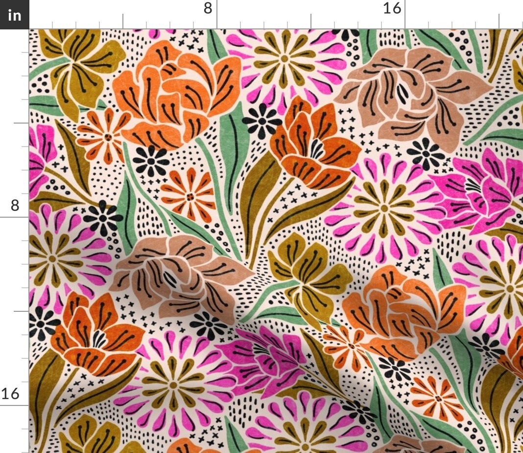 Summer Garden Bohemian Blooms Folk Art Boho Refined Orange Pink Custom Printed Fabric by Spoonflower Various Fabrics by the Yard or Fat Quarter