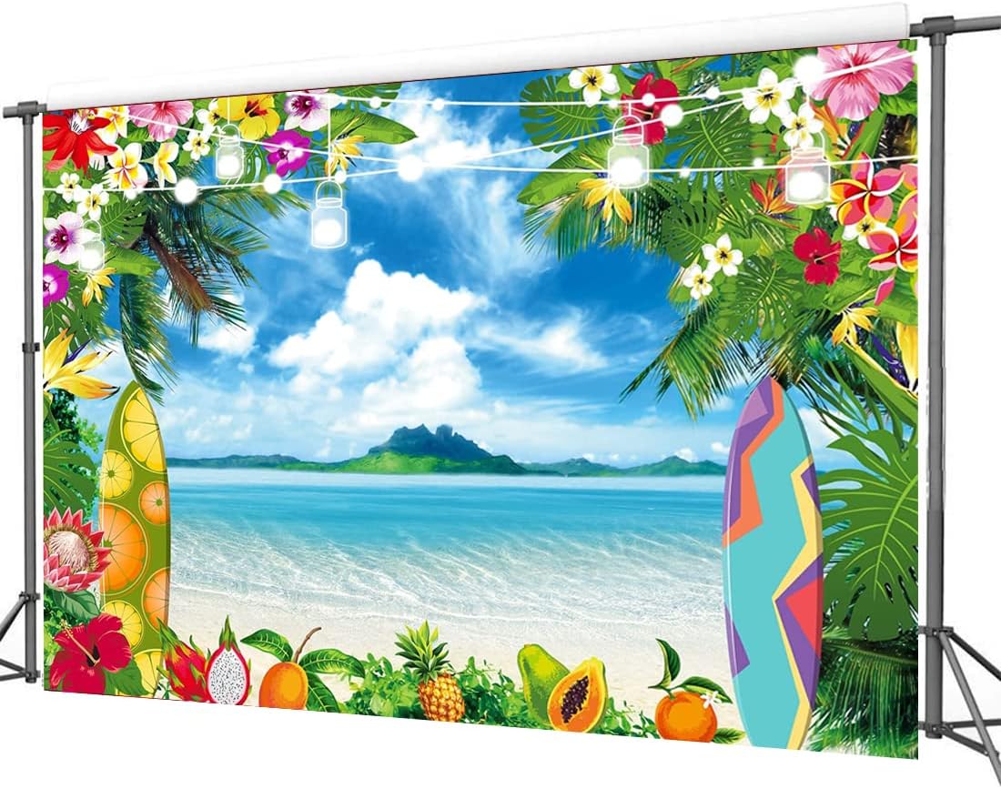 Summer Hawaiian Beach Photography Backdrop Tropical Flower Palm Leaves Surfboard Background Aloha Luau Decorations Photo Banner