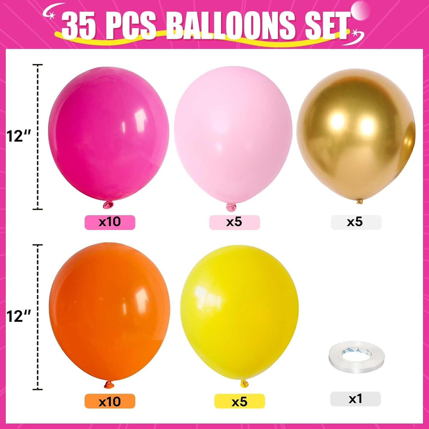 Summer Party Balloons, Hot Pink Orange Yellow Latex Balloons (12 Inches)