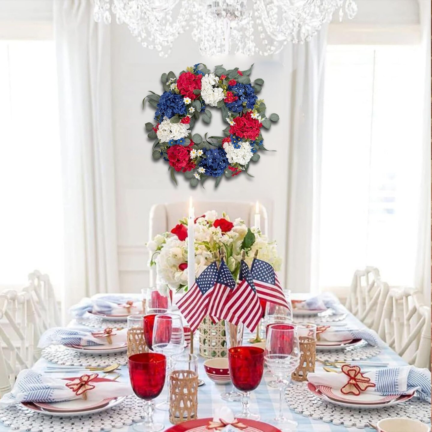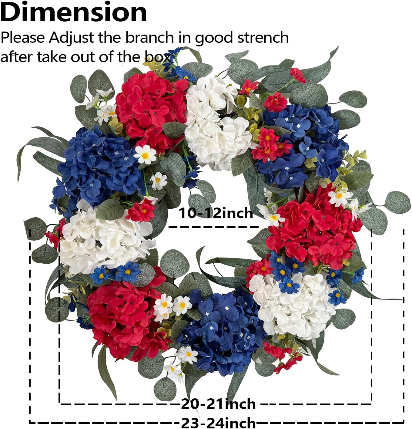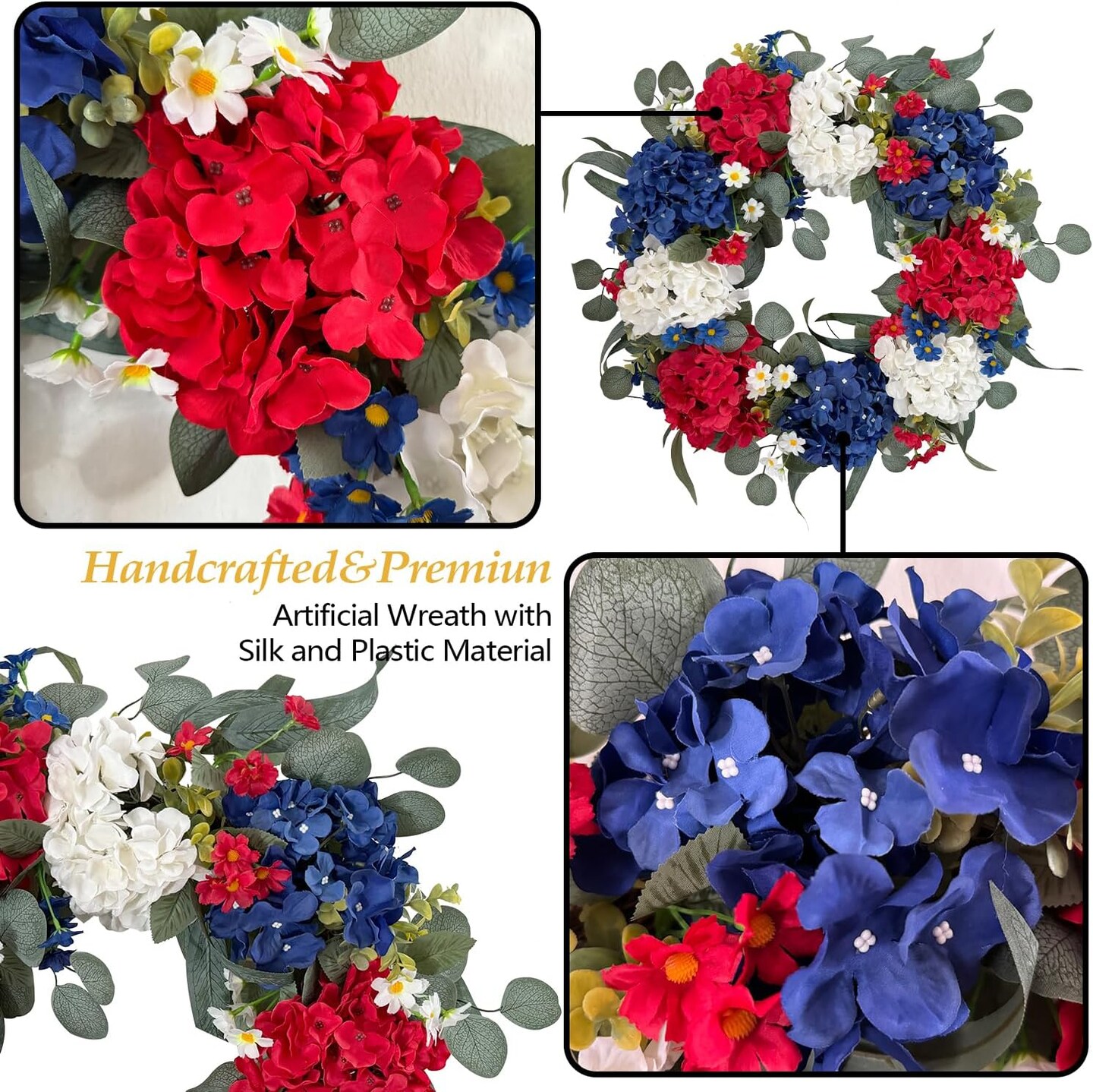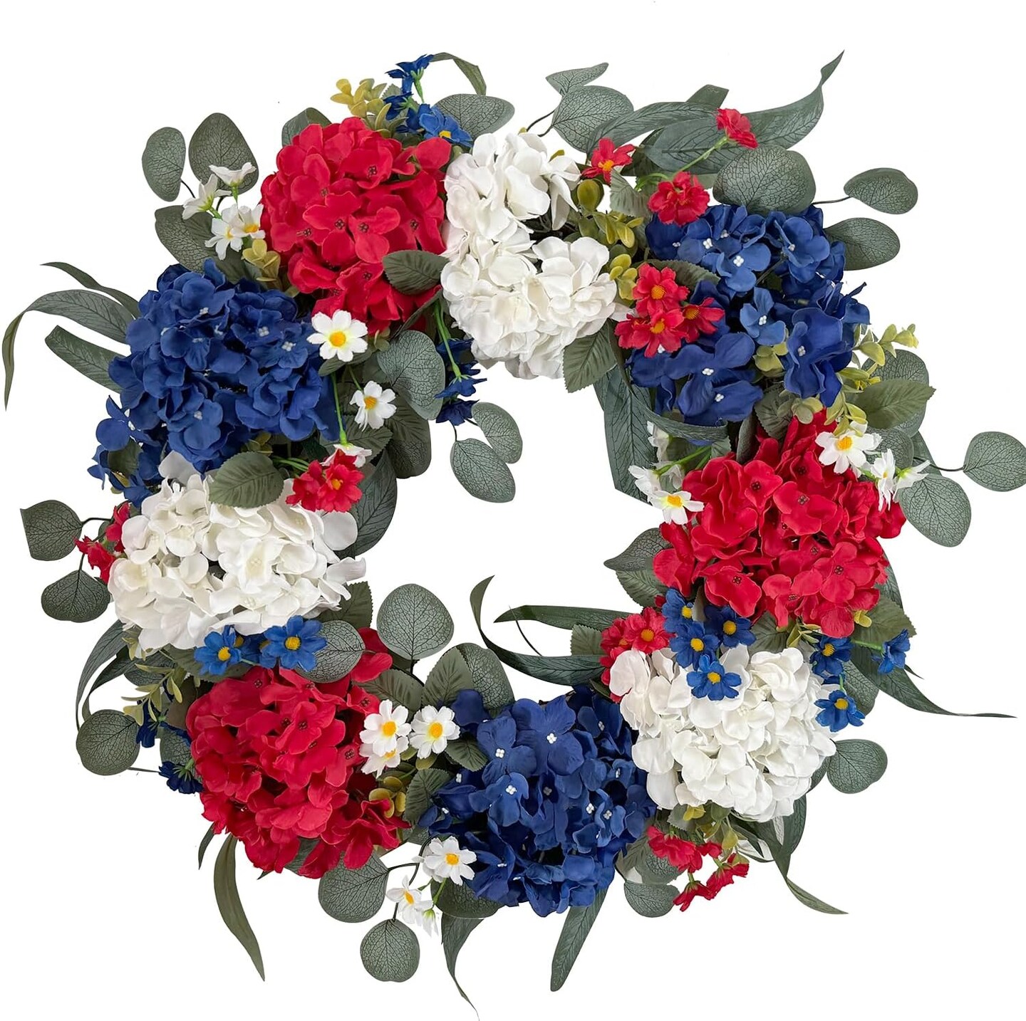 Summer Patriotic Independence Day Wreath – 20” Handmade Red, White & Blue Hydrangea Wreath for Flag Day, Memorial Day, and 4th of July Front Door, Home, Office, or Wall Décor