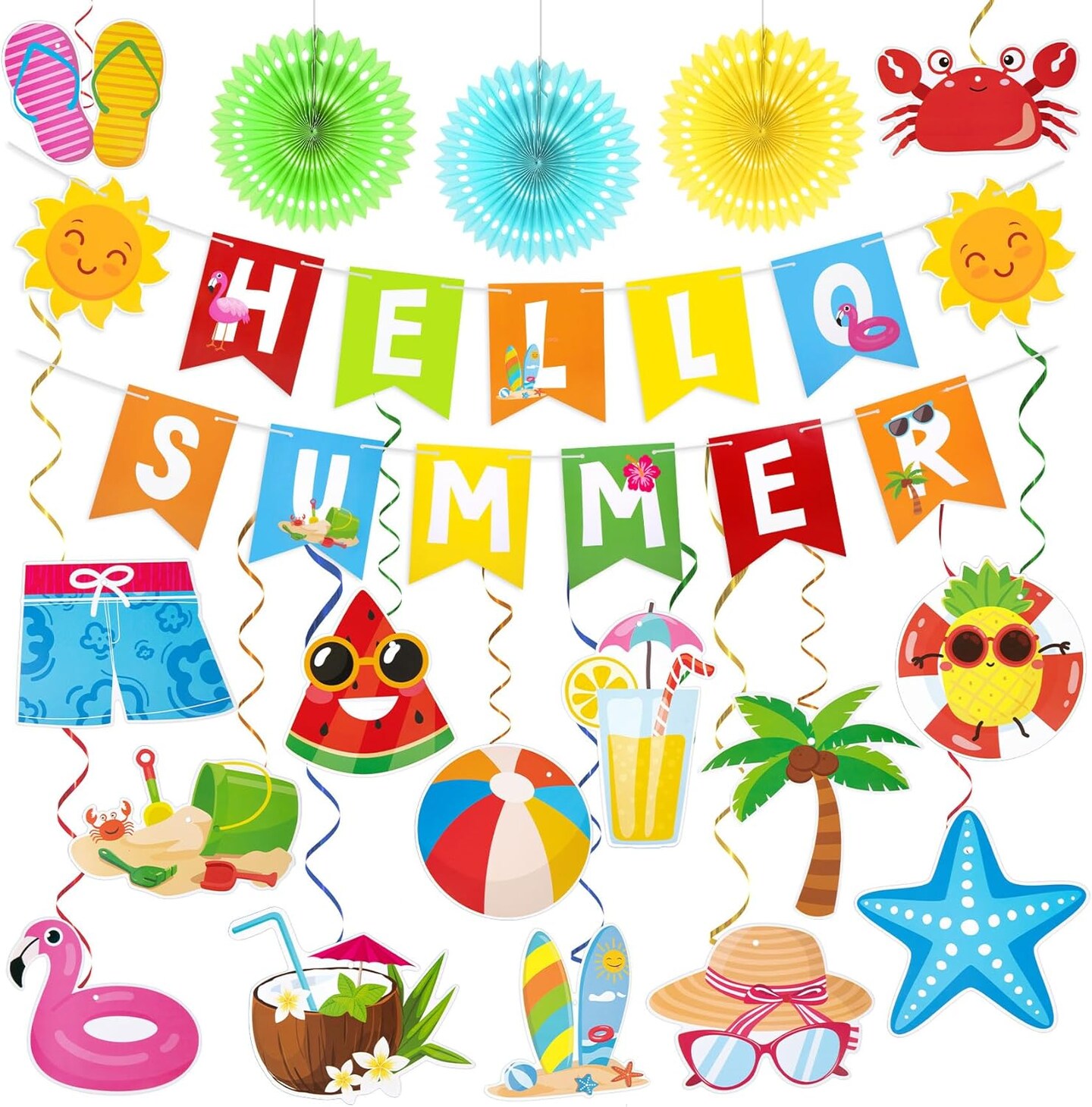 Summer Pool Party Decorations, Hello Summer Banner Paper Lanterns Beach Hanging Streams Decor for Hawaiian Luau Tropical Vacation Outfit Birthday Party Supplies Favors