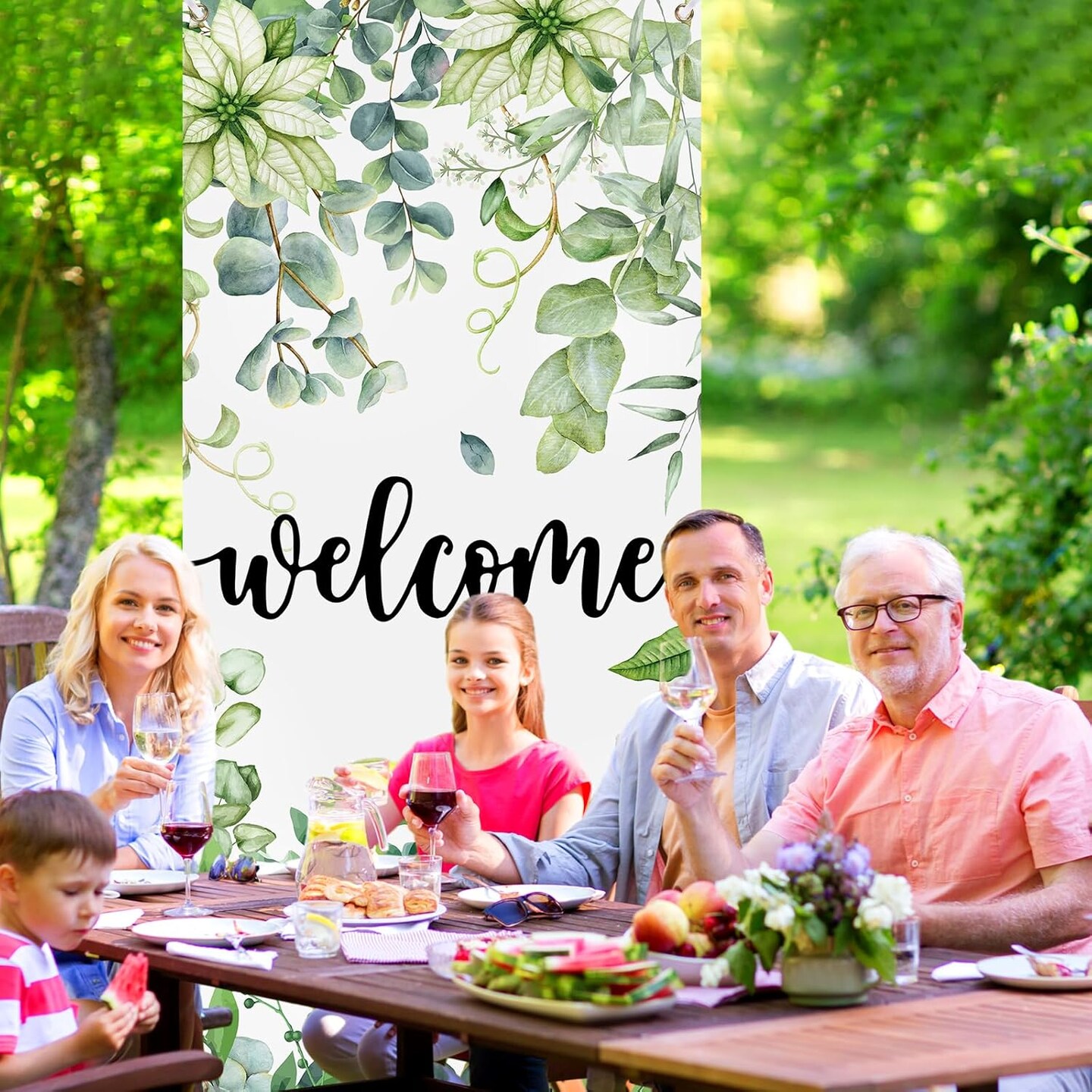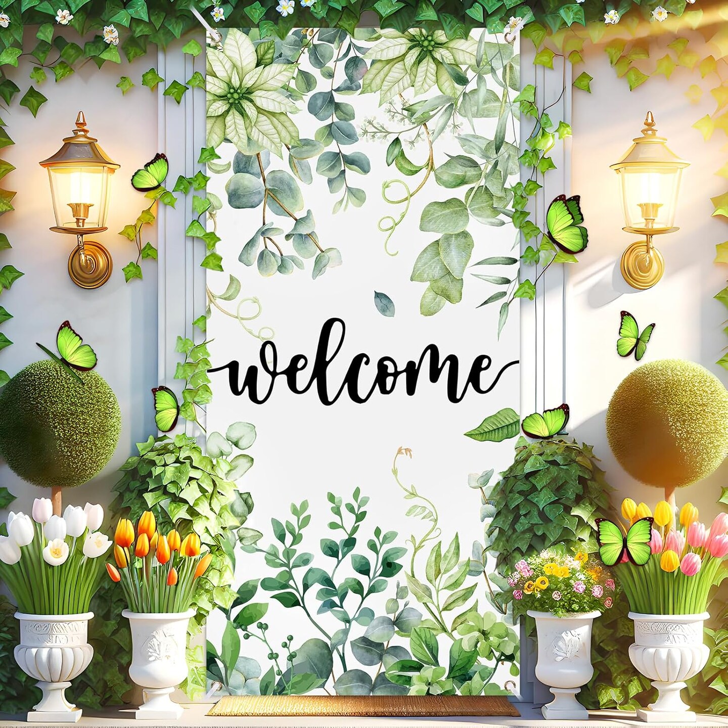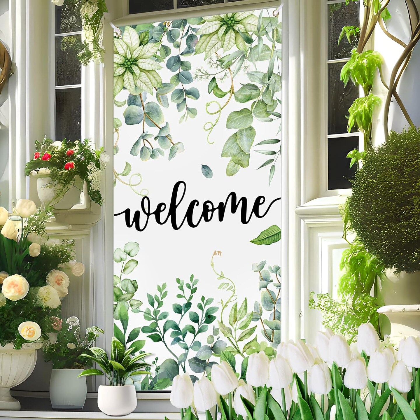 Summer Spring Welcome Door Cover Decoration Eucalyptus Flowers Greenery Door Banner Background Seasonal Porch Door Sign Welcome Front Door Cover for Indoor Outdoor Decor Party Supplies