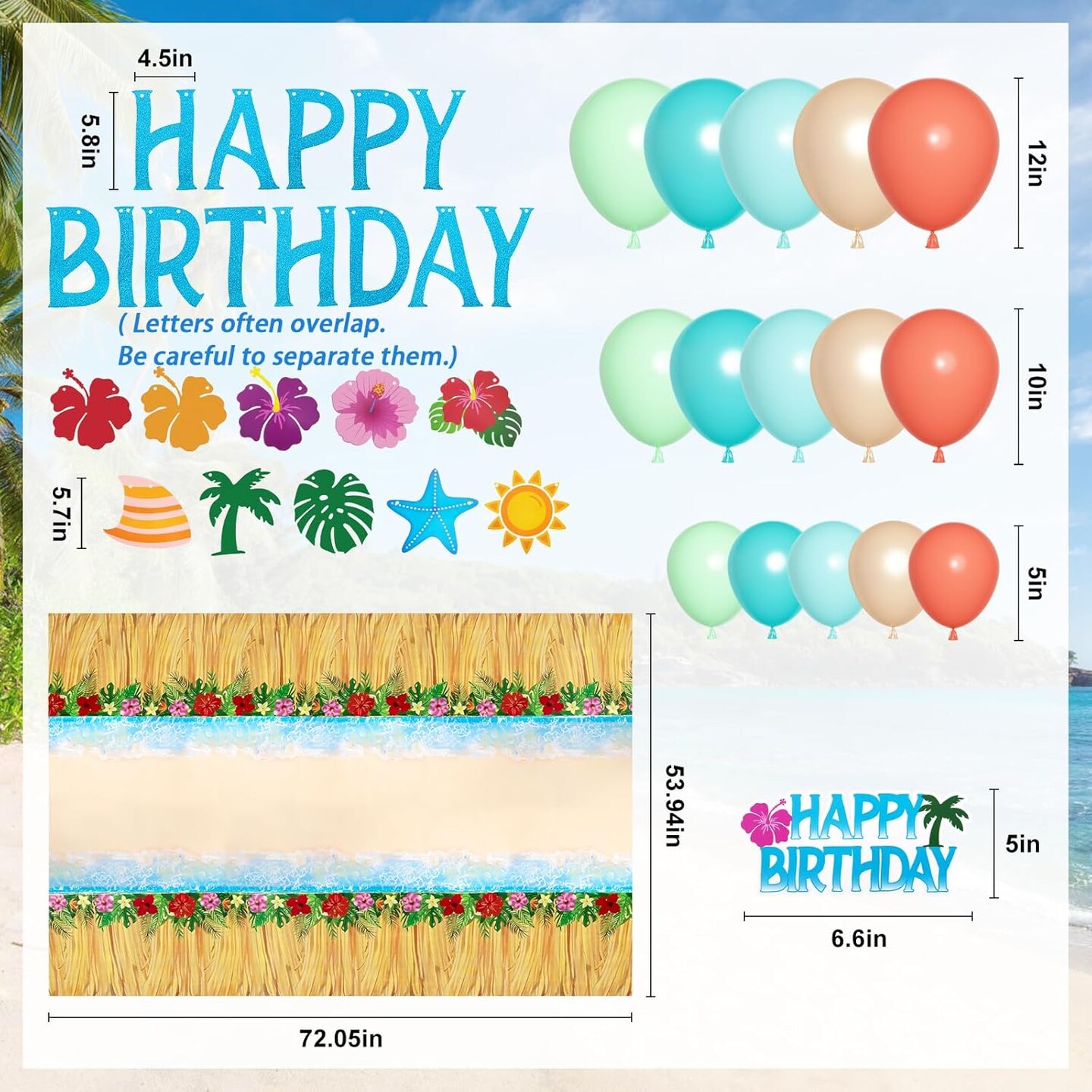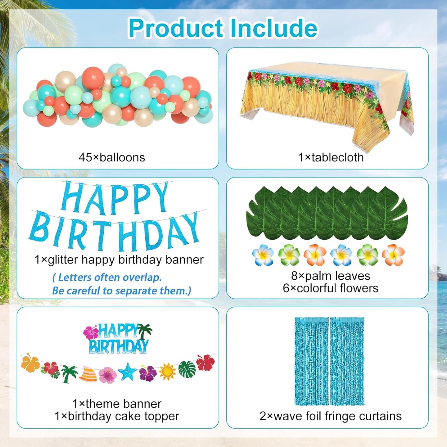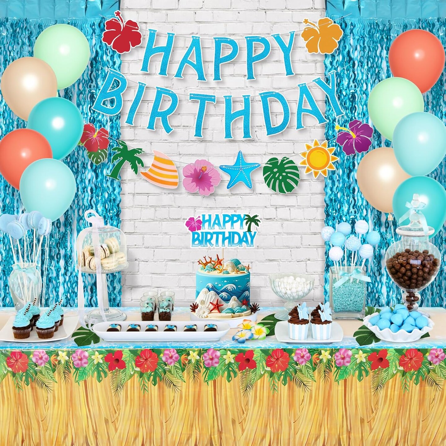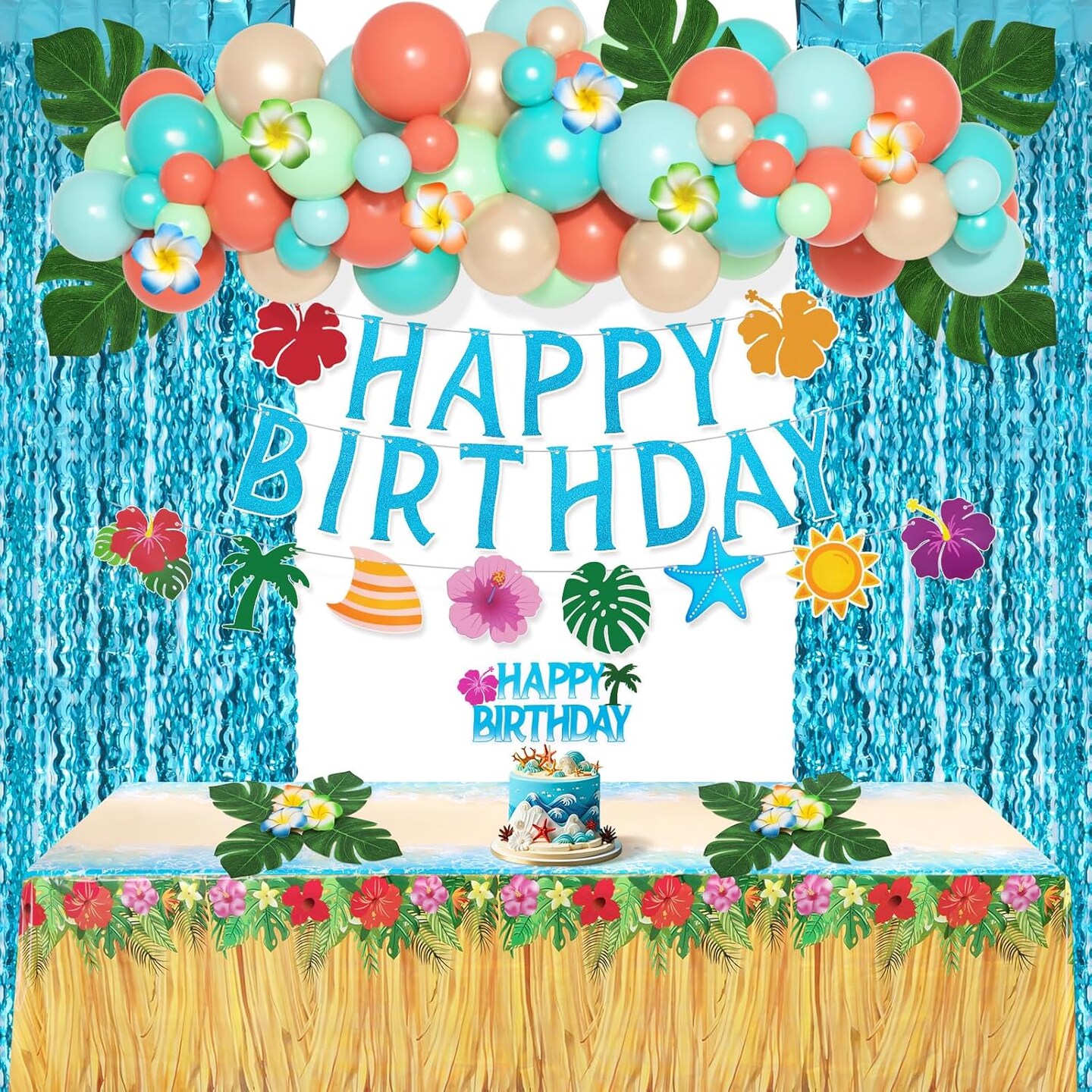 Summer Tropical Birthday Party Decorations – Beach Theme Supplies with Tablecloth, Happy Birthday Banner, Aloha Luau Balloons, Foil Fringe Curtains, Hibiscus & Palm Leaves, Cake Toppers