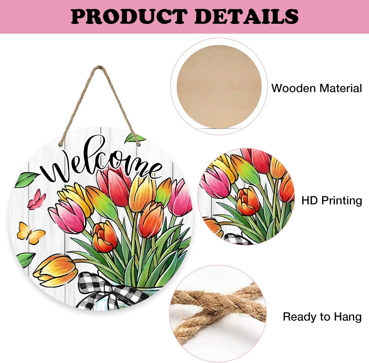 Summer Tulip Flowers Front Door Sign, Floral Butterfly Mason Jar Wood Door Hanger Outdoor Outside Porch Decor, Seasonal Farmhouse Wooden Wreath Indoor Wall Hanging Decoration