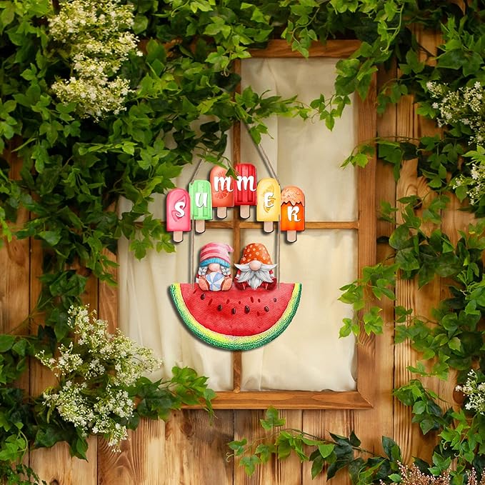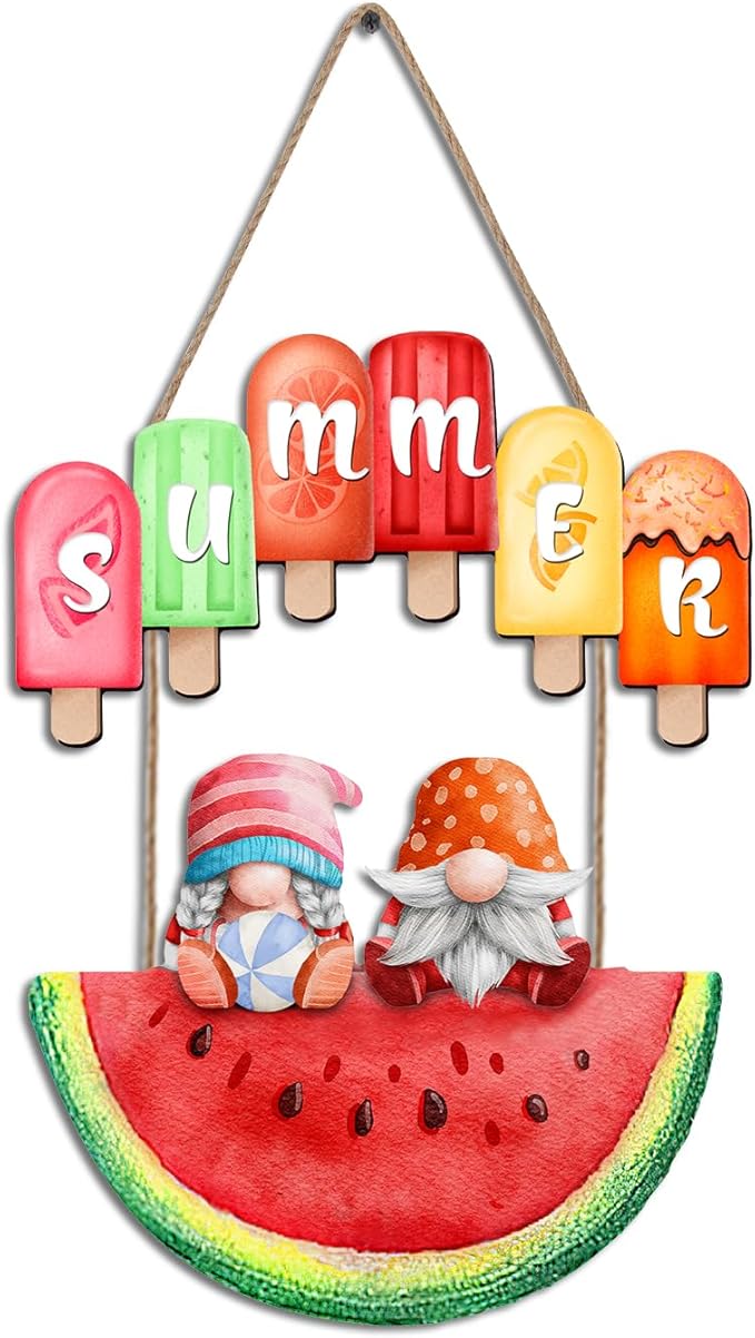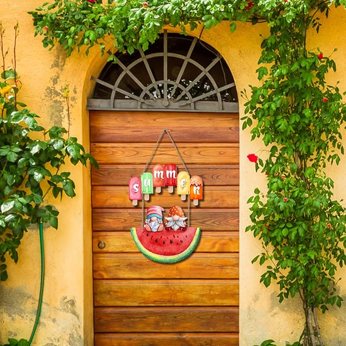 Summer Watermelon Wall Decor Wooden Gnome Sign Popsicle Summer Hanging Decoration Tropical Juicy Watermelon Front Door Hanger Ice Lolly Welcome Decor For Garden Yard