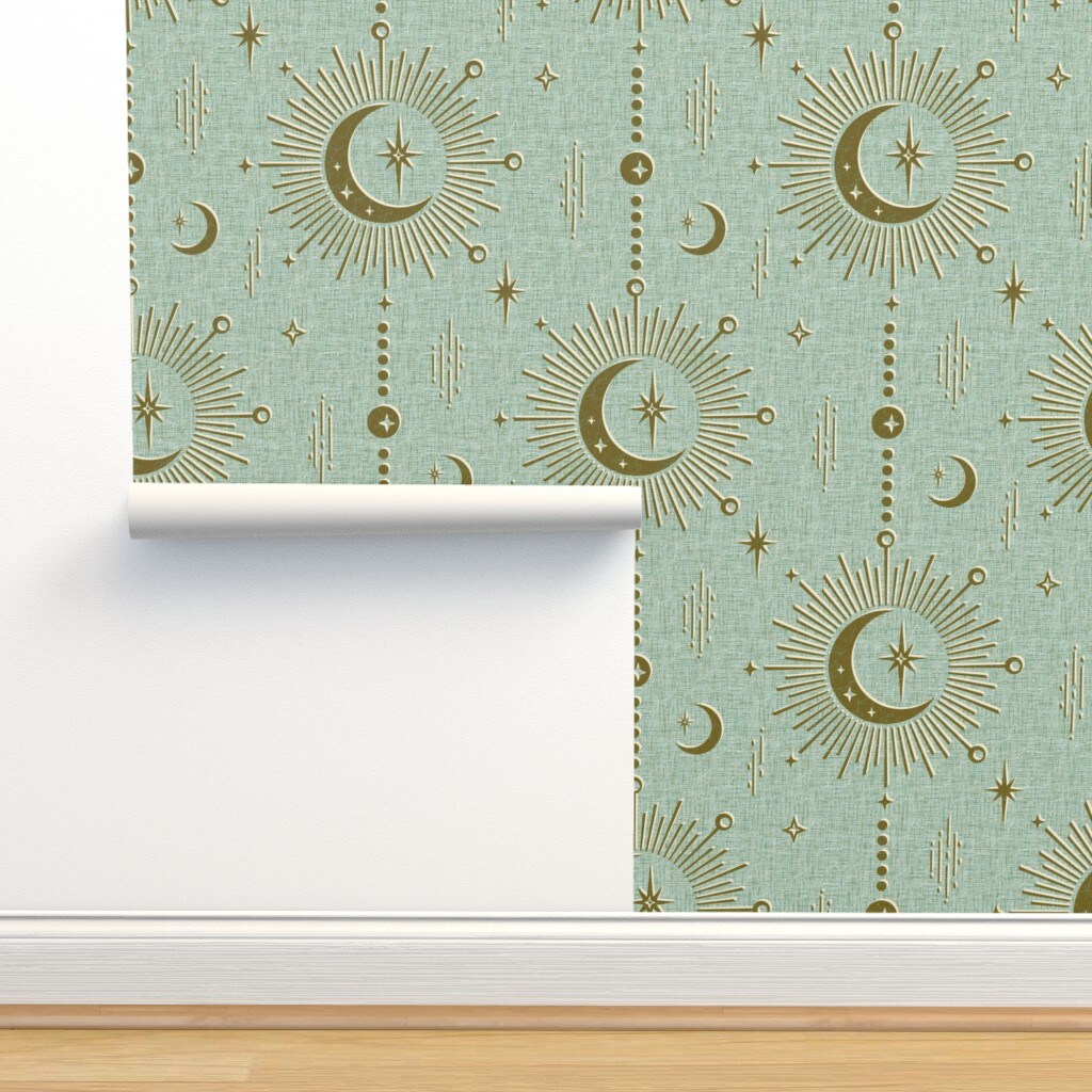 Sun And Moon Stars Retro Fifties Starburst Solar Good Luck Talisman Moroccan Lunar Hamsa Fortune Telling Custom Pre-pasted Wallpaper by Spoonflower Pre-Pasted Wallpaper 2FT Wide