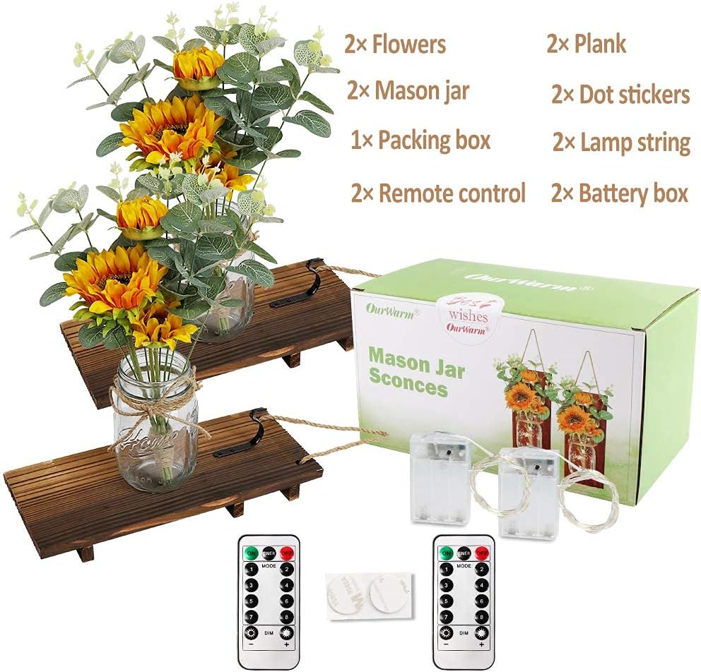 Sunflower Wall Sconces Set of Two, Mason Jar Sconces Farmhouse Summer Wall Decor