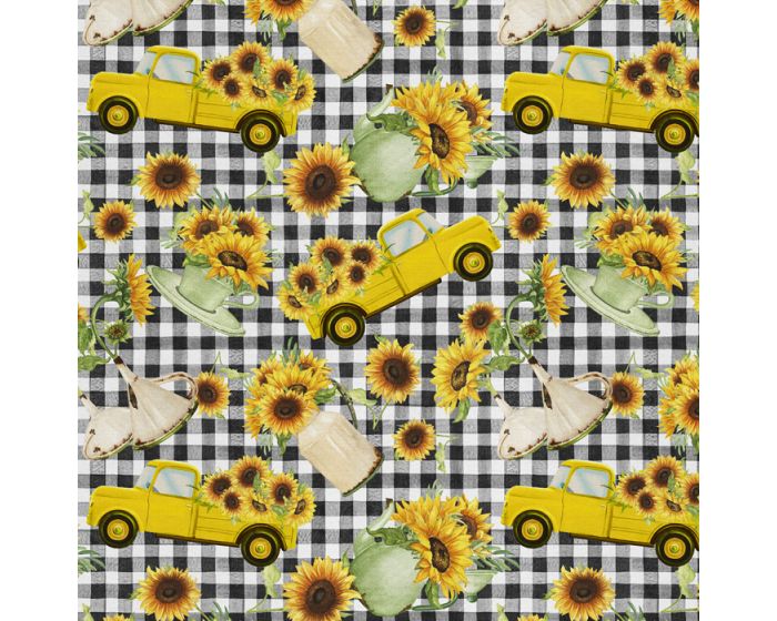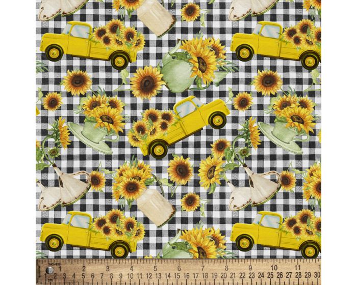 Sunflowers Trucks Vases Cotton Fabric | By The Yard | Sewing and Crafting | 44 inches wide