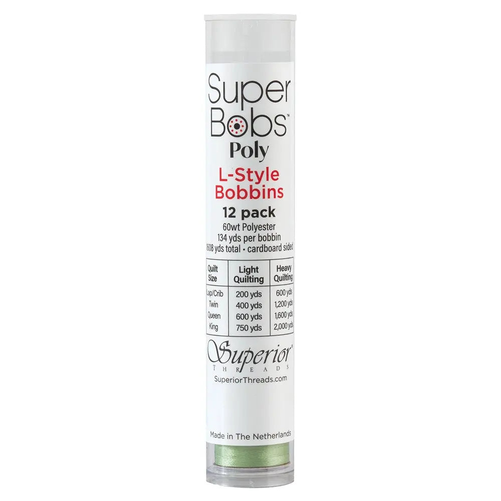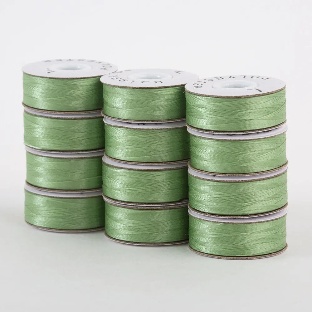 Super Bobs Poly #614 Light Green (L-Style) 12 pack pre-wound bobbins.