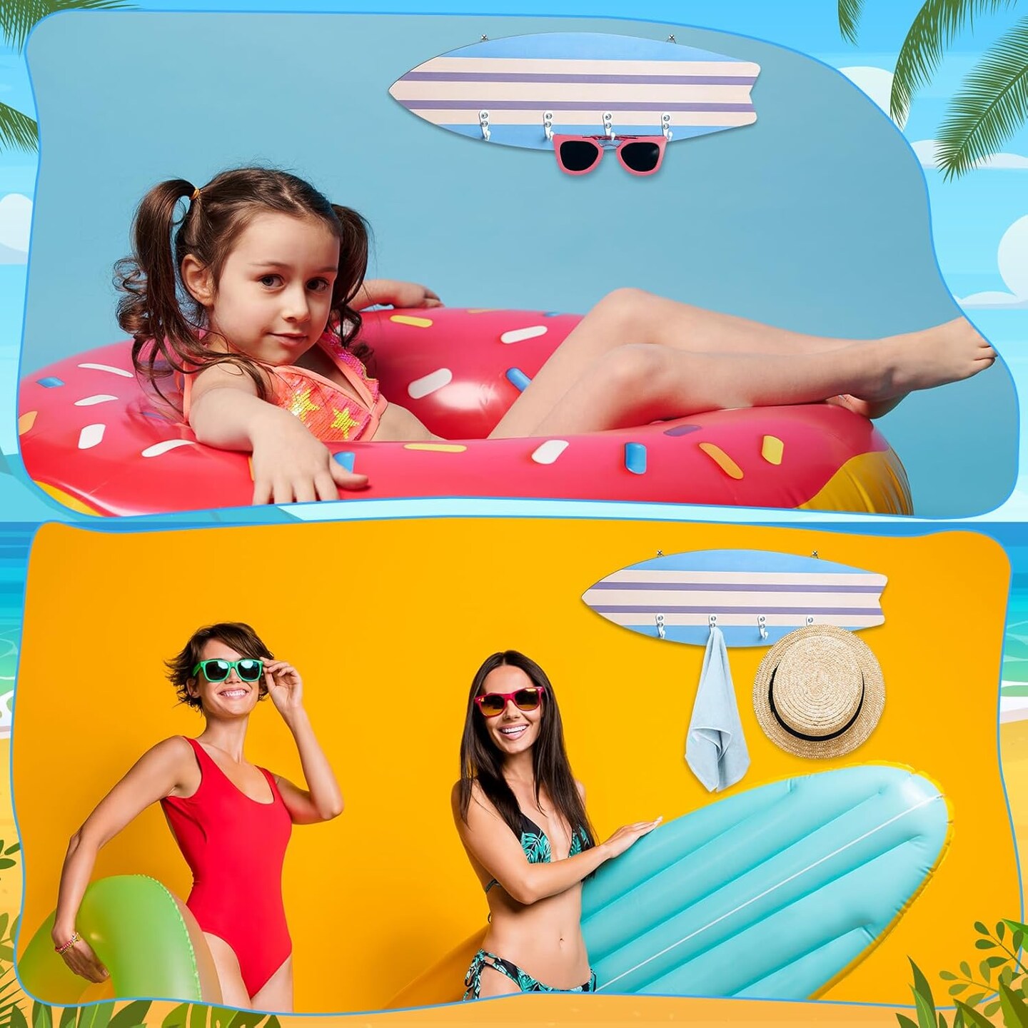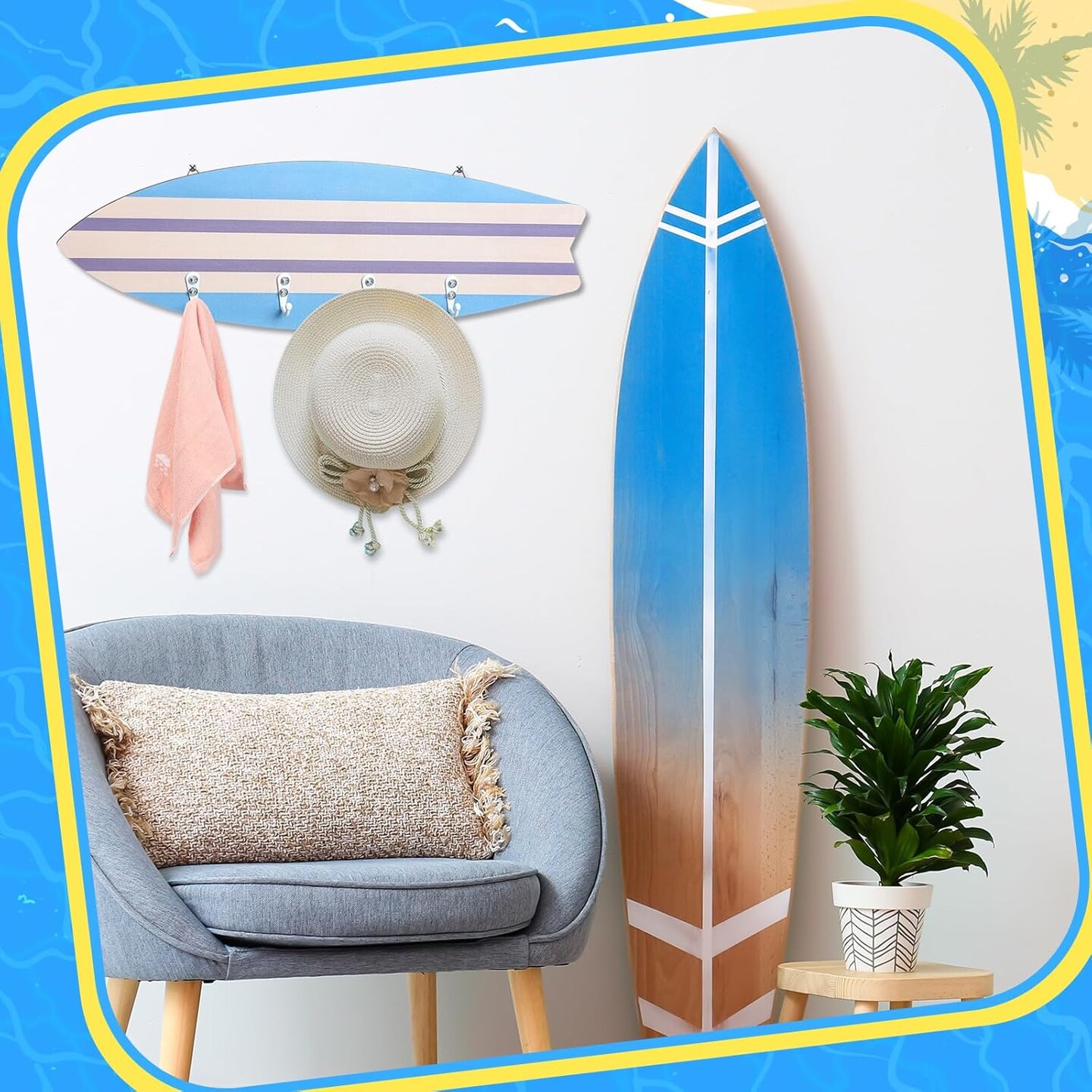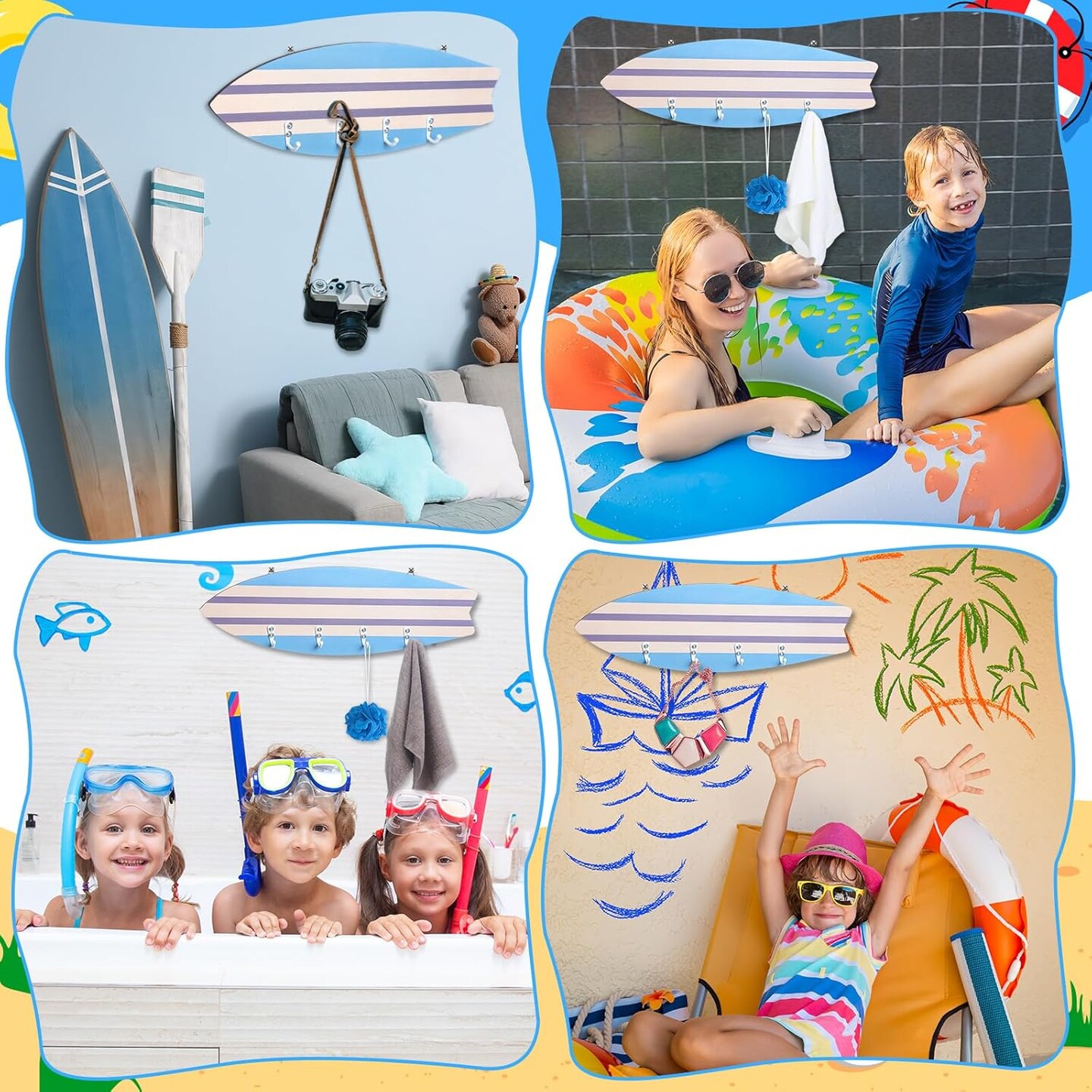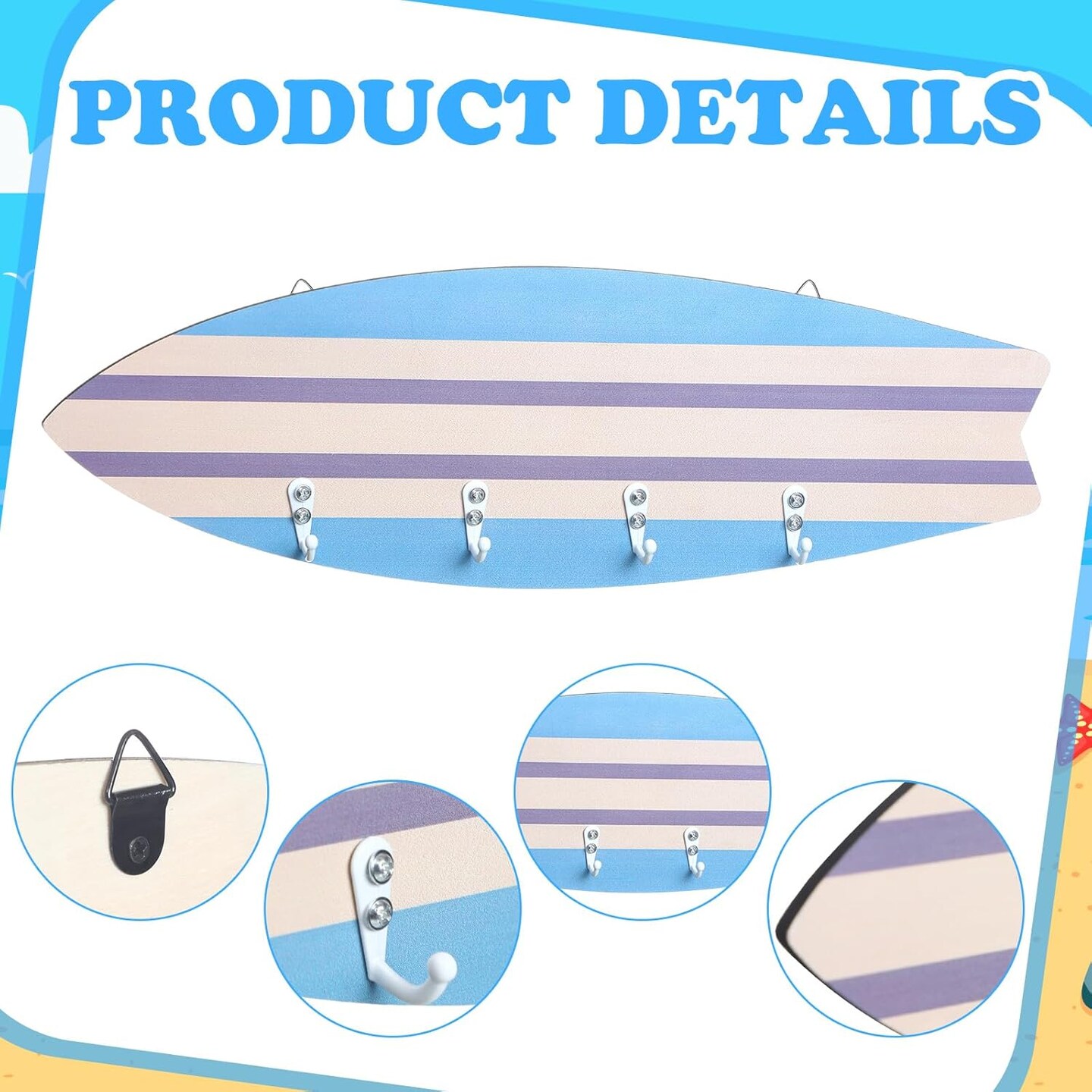 Surfboard Wall Hooks Surfboard Pool Towel Hooks Wooden Ornament Hooks with 4 Hooks Surfing Decorative Towel Hooks Rack Hangers for Beach Area Outdoor Swimming Pool Bathroom Bedroom Decoration