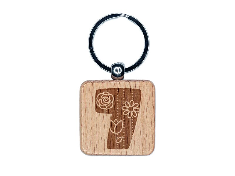 Sweet and Cute Flowers Rounded Block Number 7 Seven Engraved Wood Square Keychain Tag Charm