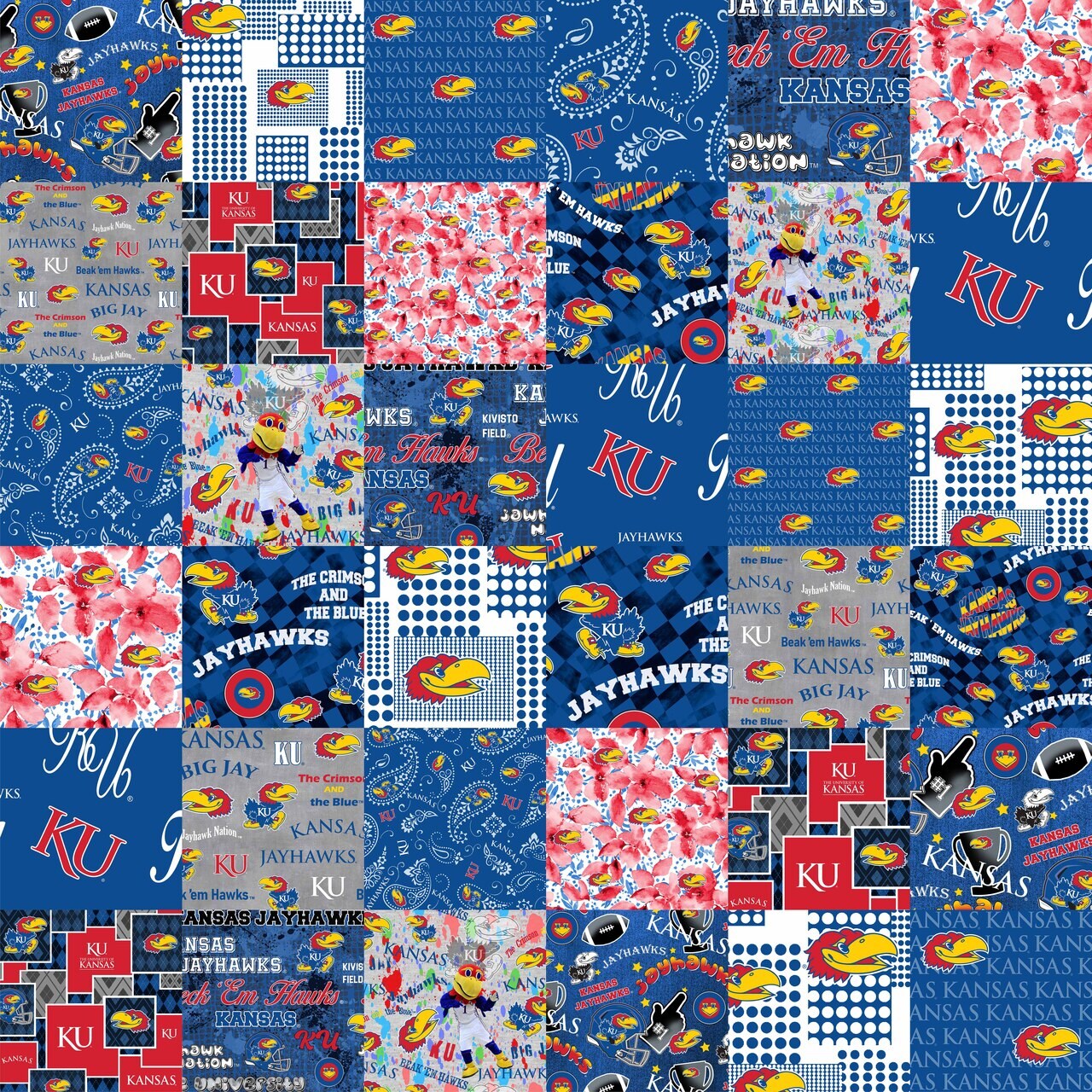Sykel Enterprises-University of Kansas Cheater Quilt Printed Cotton Fabric-Kansas Jayhawks Cotton Fabric with Patchwork Cheater Quilt Print-60” Width