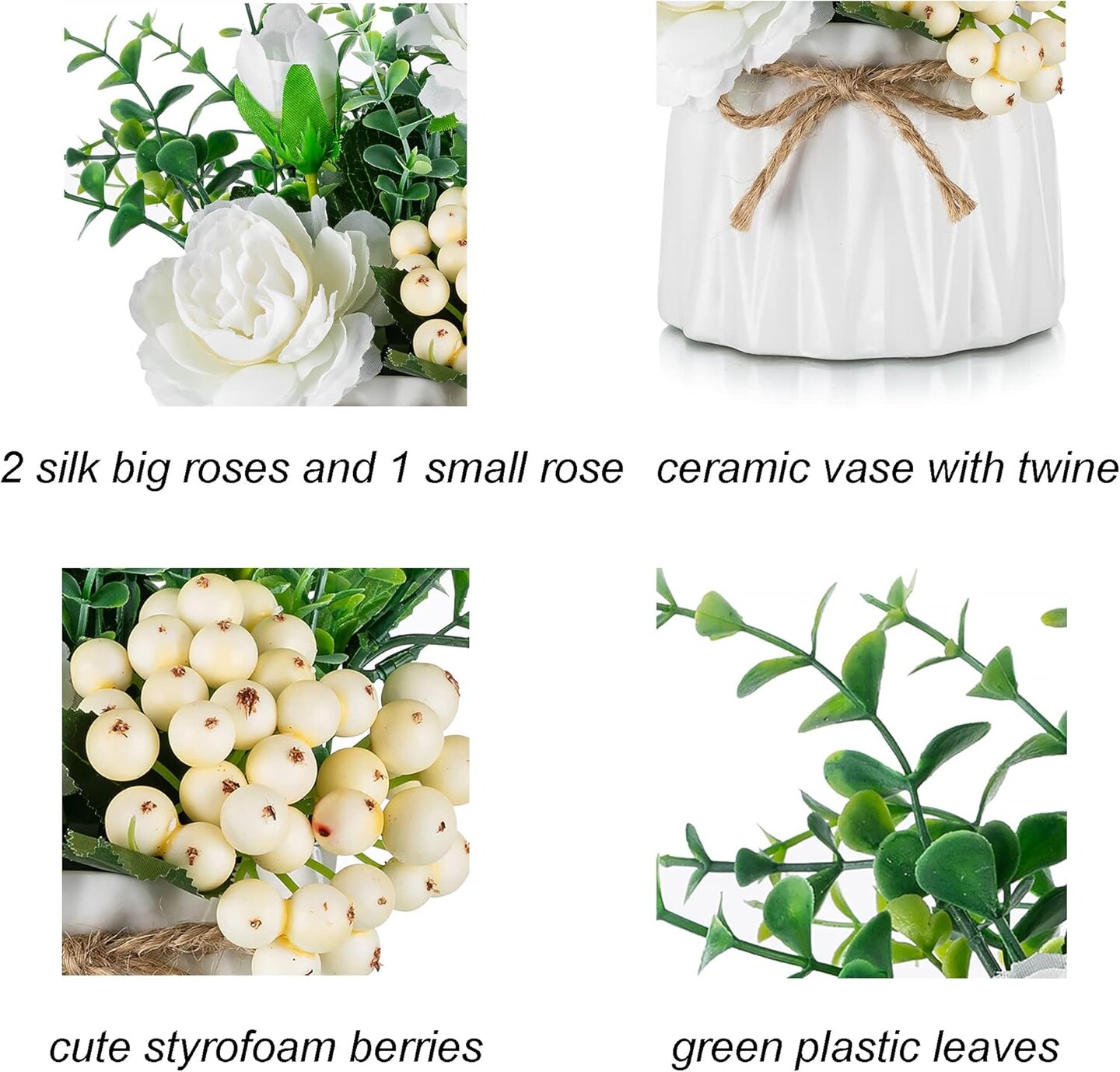 Table Decor Artificial Flowers Vase Small Fake Flower White Arrangement 2pcs Floral Arrangement for Tables centerpieces Kitchen Dining Room Decorations Faux Flower in Vase Silk Roses