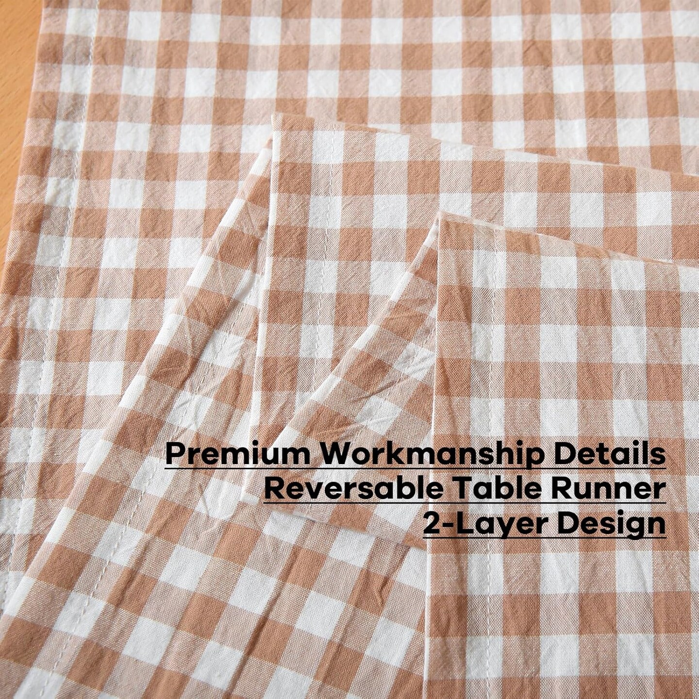 Taupe White Plaid Gingham Ruffle Table Runner 90 inches Long 100%,(Taupe, 90"x13")