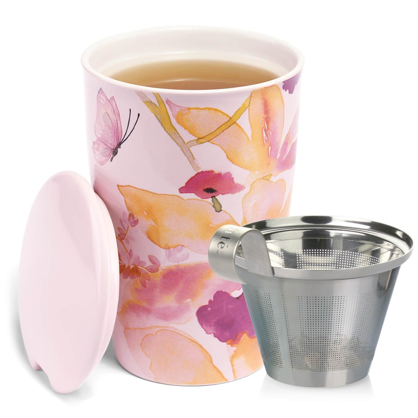 Tea Forte Double-Walled Ceramic Kati Cup, Removable Stainless Steel Infuser Basket and Lid, Steeps 12 oz Loose Leaf Tea, Dishwasher & Microwave Safe, Mariposa