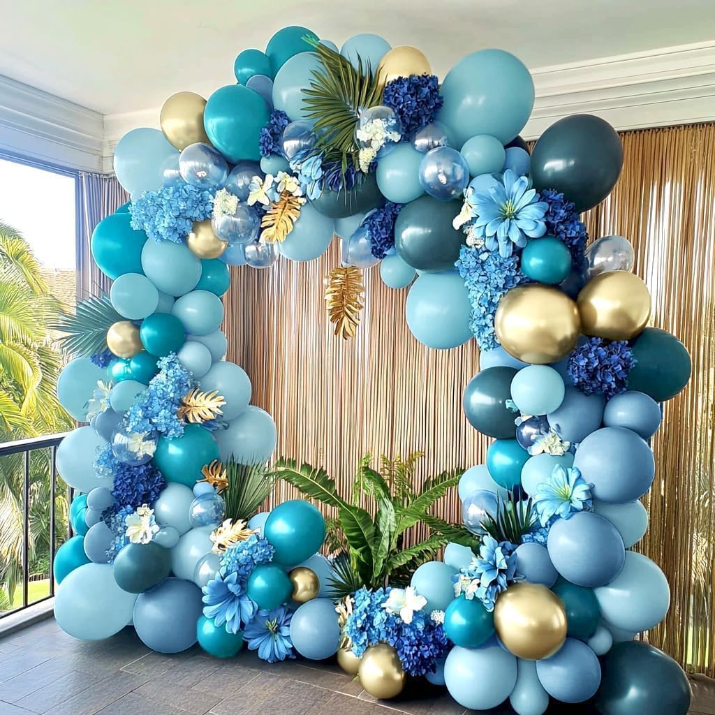 Teal Blue & Gold Balloons – Double-Stuffed Dusty Blue and Turquoise Balloon Set in Mixed Sizes, Teal Gold Balloon Garland for Birthday, Wedding, New Year, Anniversary & Baby Shower Ocean Party Décor