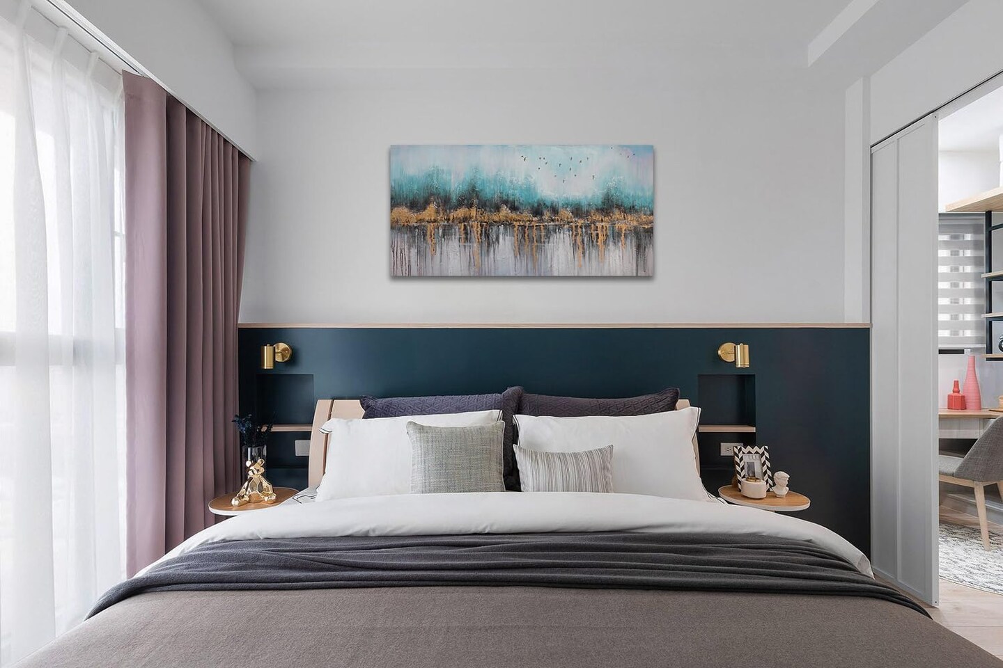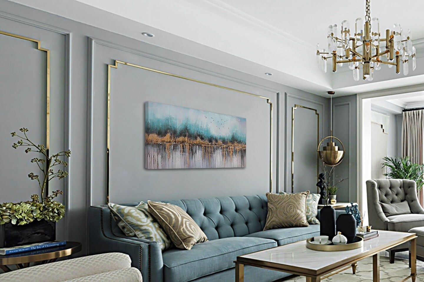 Teal & Gold Abstract Canvas Wall Art 40x20" – Framed, Textured, Ready to Hang.