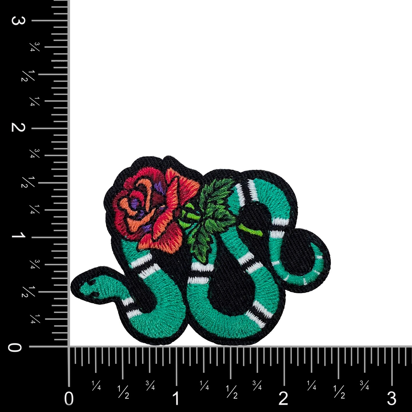 Teal Green Snake with Rose, Jewel-Tones, Flowers, Embroidered, Iron on Patch