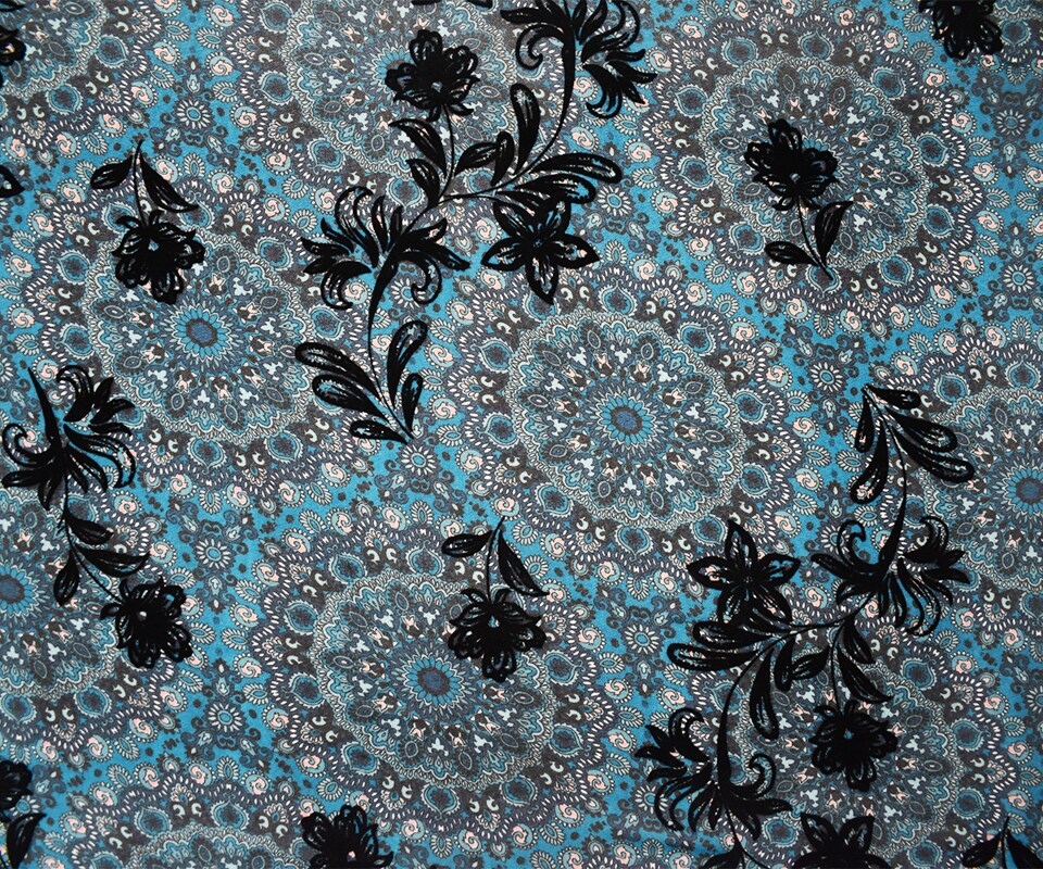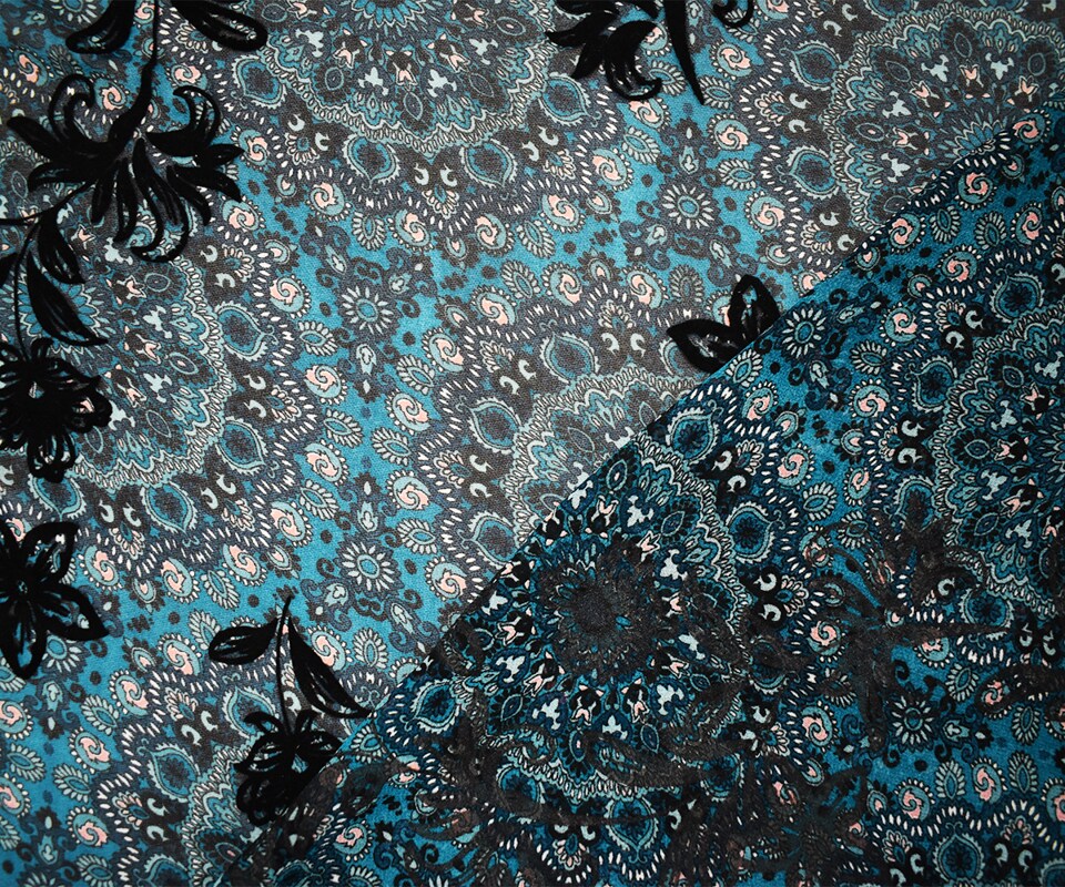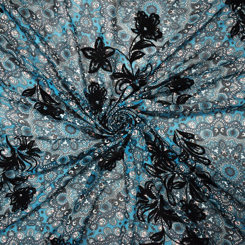 Teal-Multi Poly Moroccan Floral Velvet Flock Chiffon Woven Fabric By the Yard
