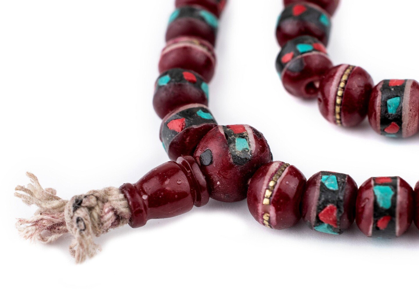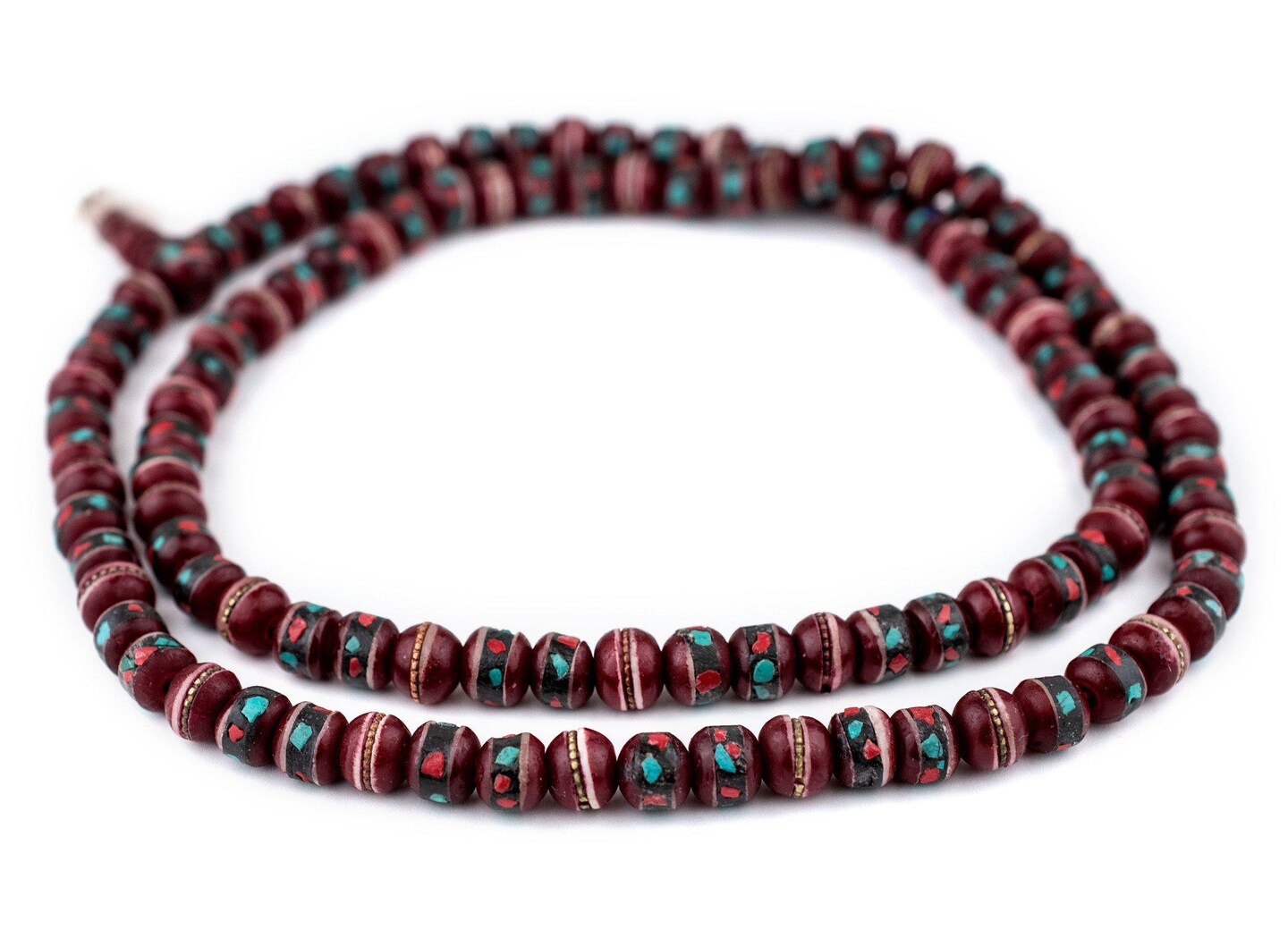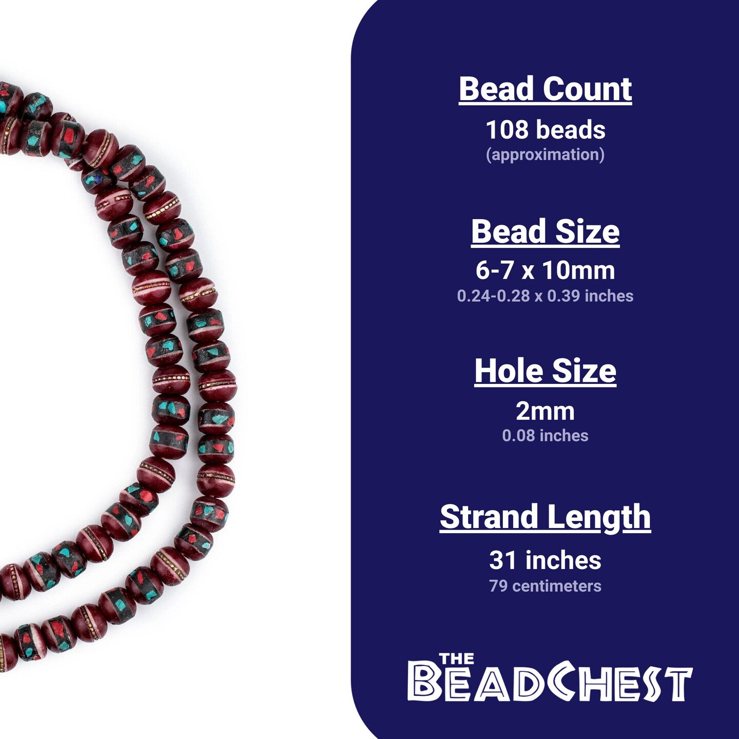The Bead Chest Crimson Red Inlaid Bone Mala Beads 10mm Nepal Round Large Hole 31 Inch Strand