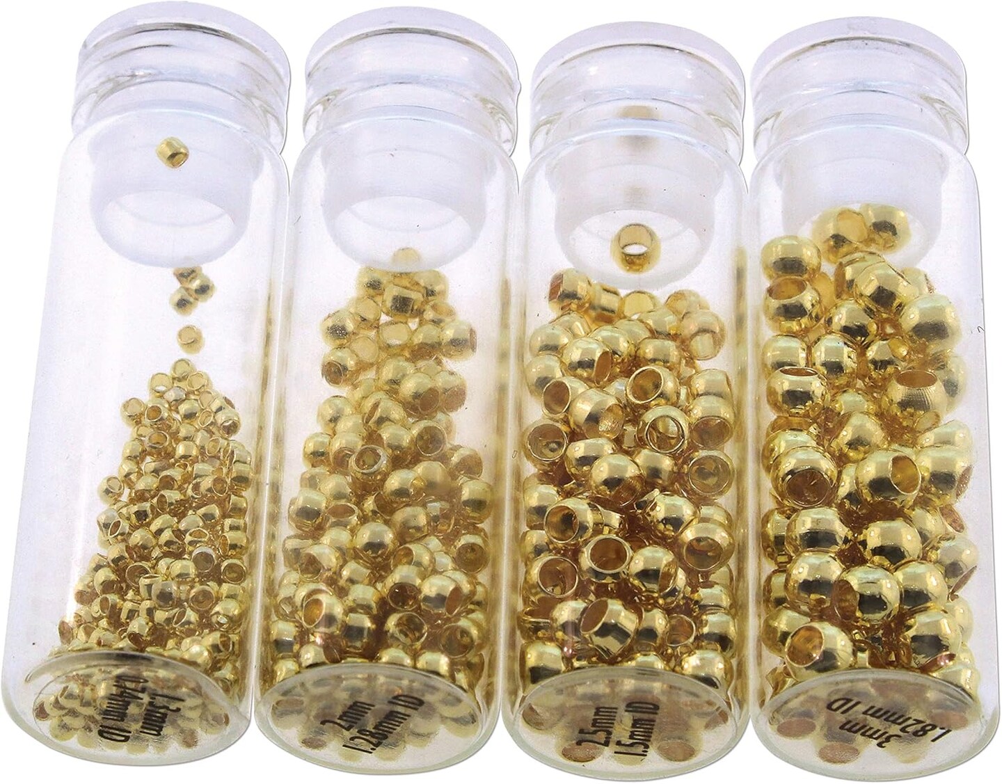 The Beadsmith Basic Elements Crimp Beads, 4 Vials in Assorted Sizes, Gold Color, Uniform Round Shape, No Sharp Edges, Designed to Secure The Ends of Jewelry Stringing Wires and Cables
