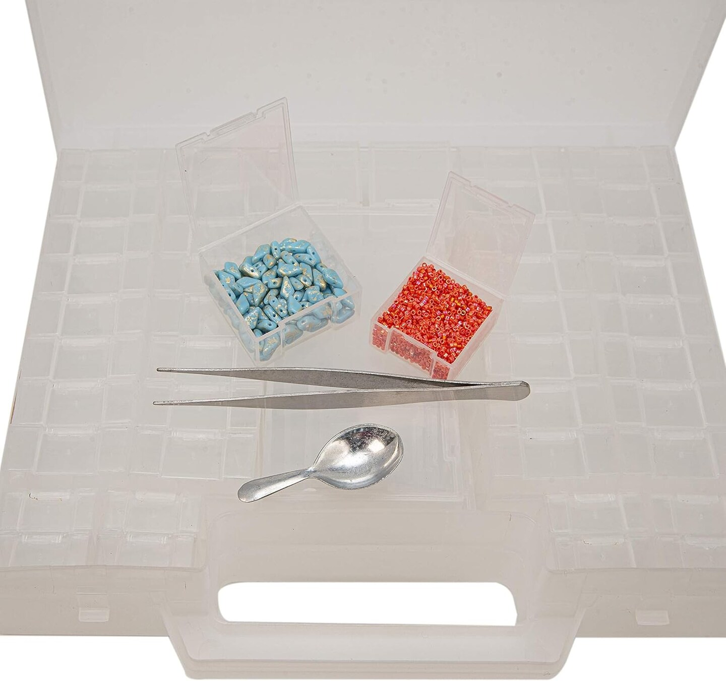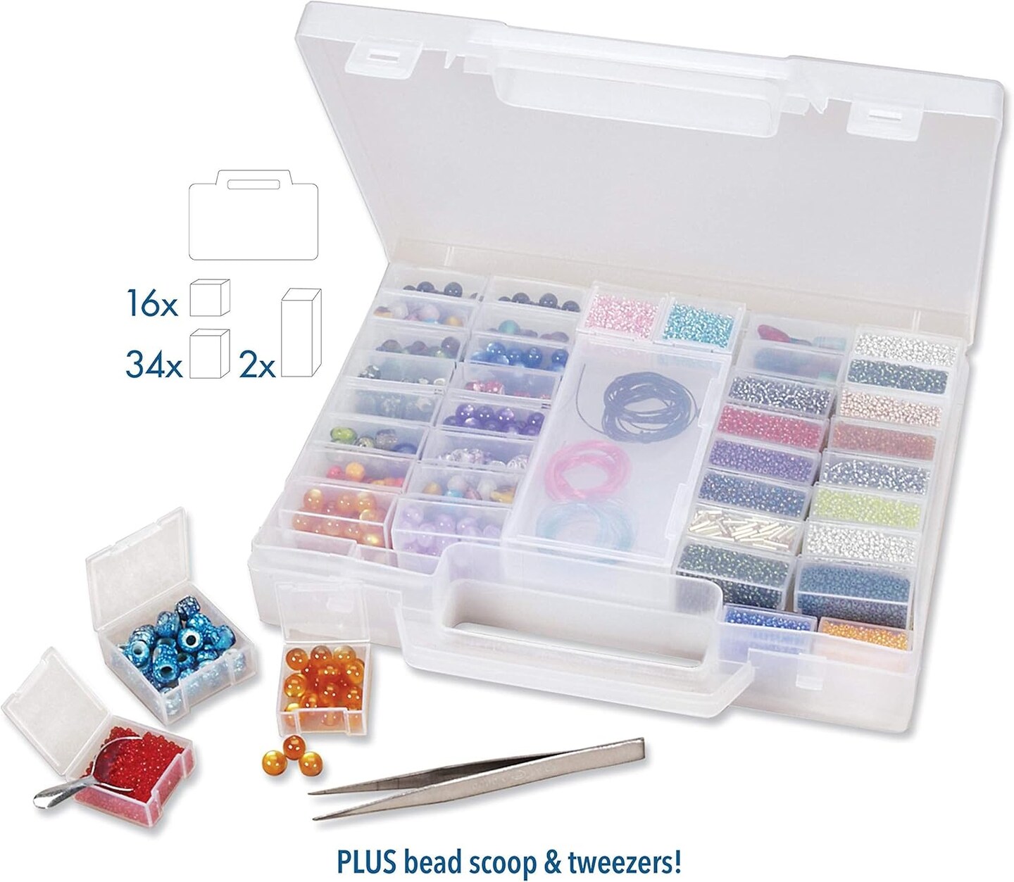 The Beadsmith Bead Organizer Carrying Case, 55 piece set, with removable compartments in assorted sizes, a carrying case, plus a bead scoop and tweezer.