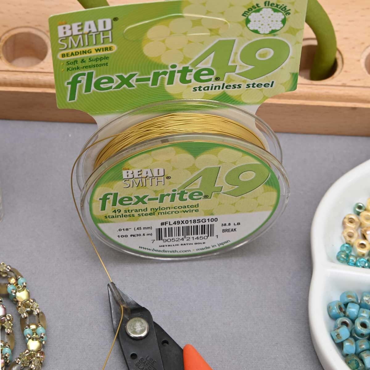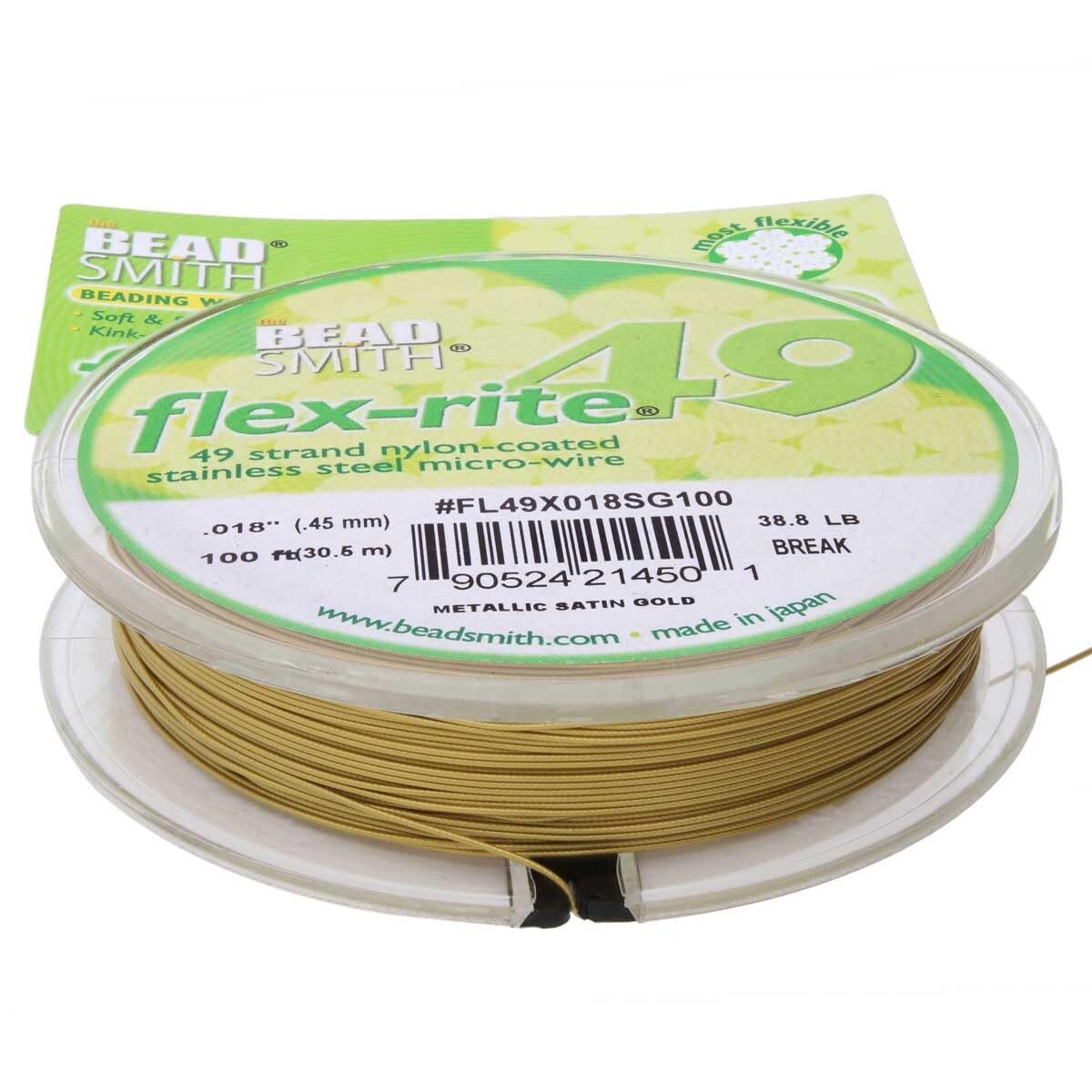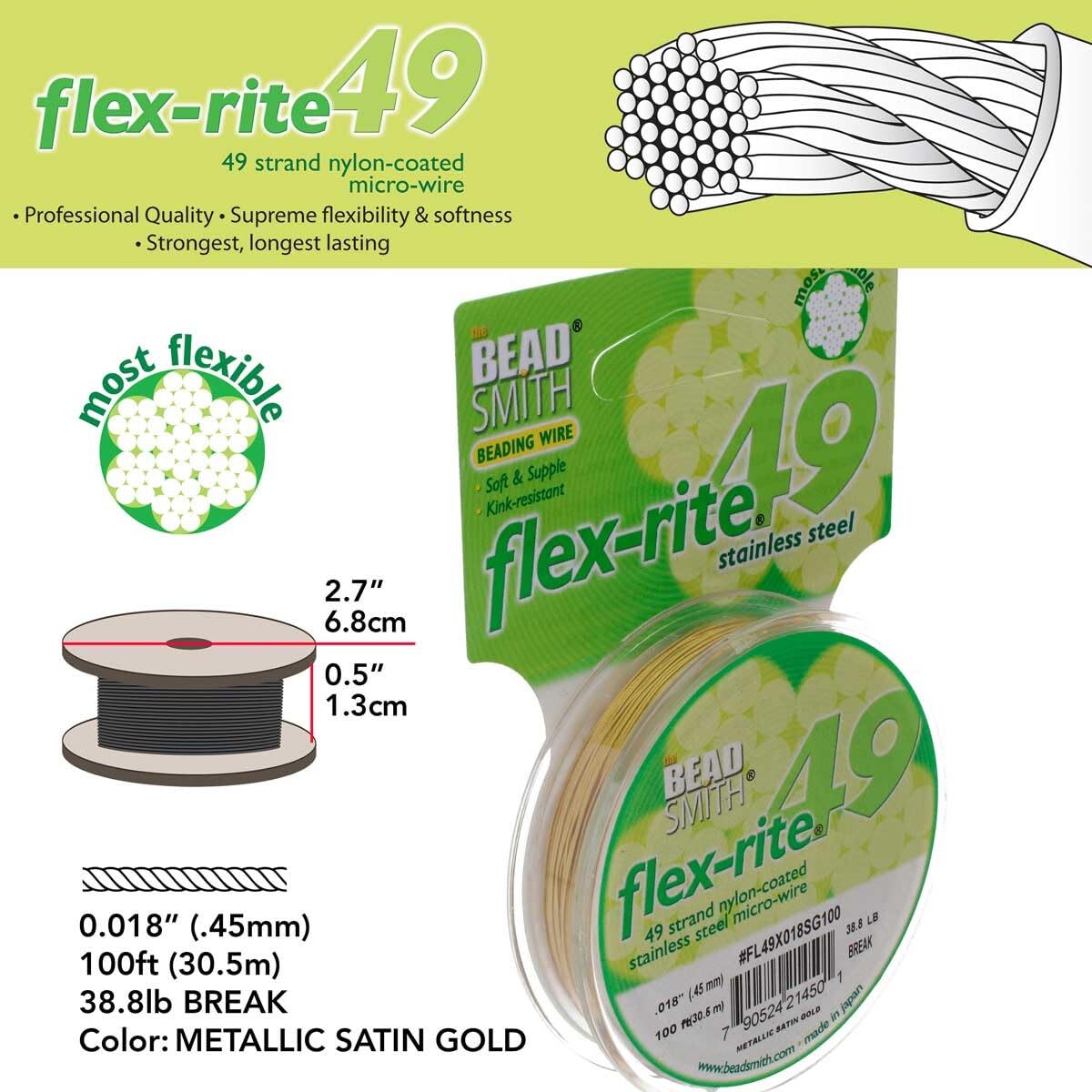 The Beadsmith Flex-Rite Wire – 49 Strand, Nylon Coated, Stainless Steel Beading Wire – Satin Gold Color, 018” Diameter, 100-foot Spool – Flexible Wire for Necklace, Bracelet and Jewelry Making