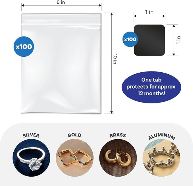 The Beadsmith Jewelry Anti-Tarnish Tabs and Resealable Zip Bags – 1x1” Non-Abrasive Tabs and 3x3” Clear Bags, for Long-Lasting Shine and Jewelry Protection, 100 of Each