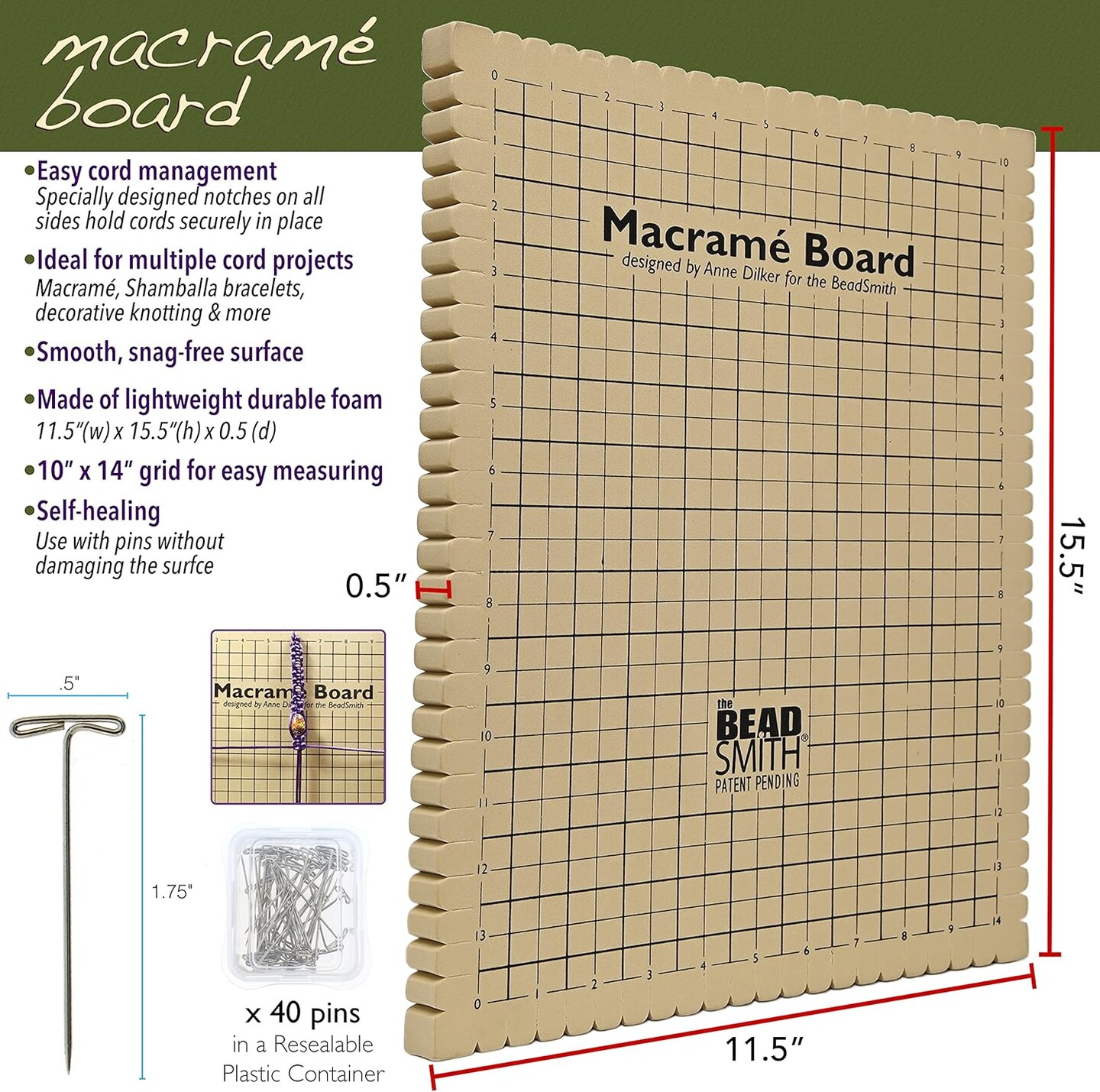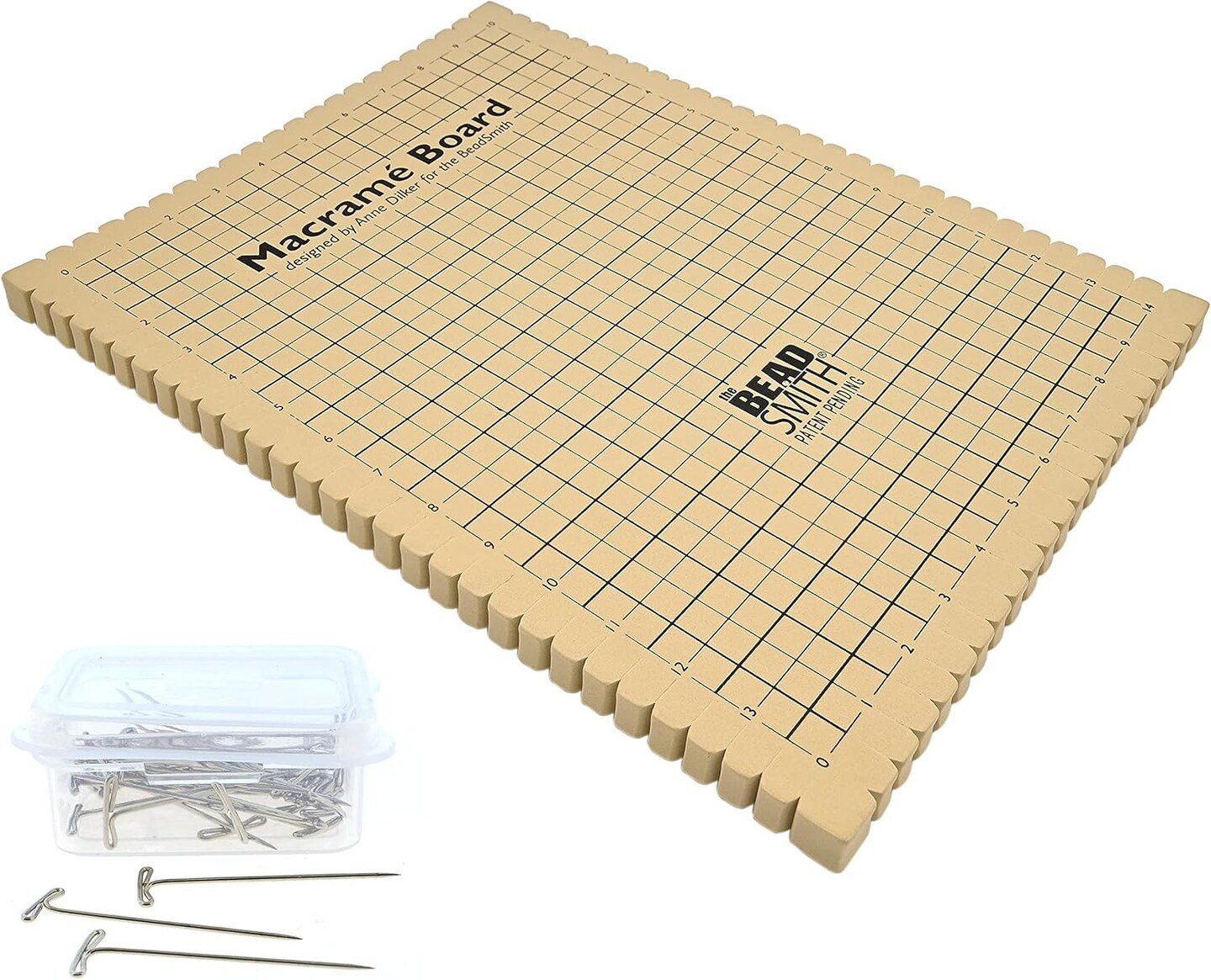 The Beadsmith Macrame Combo - Bead Board 10 x 14 inches - Box of 40 T-pins 1.75 inches - Bracelet Project & Instructions Included - Ideal for securing & Creating Macrame and Knotting Creations