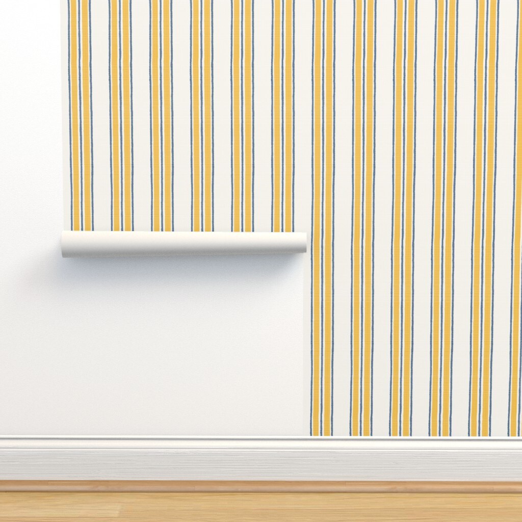 Ticking Stripe Traditional Classic Timeless Blue Yellow Cream Custom Pre-pasted Wallpaper by Spoonflower Pre-Pasted Wallpaper 2FT Wide